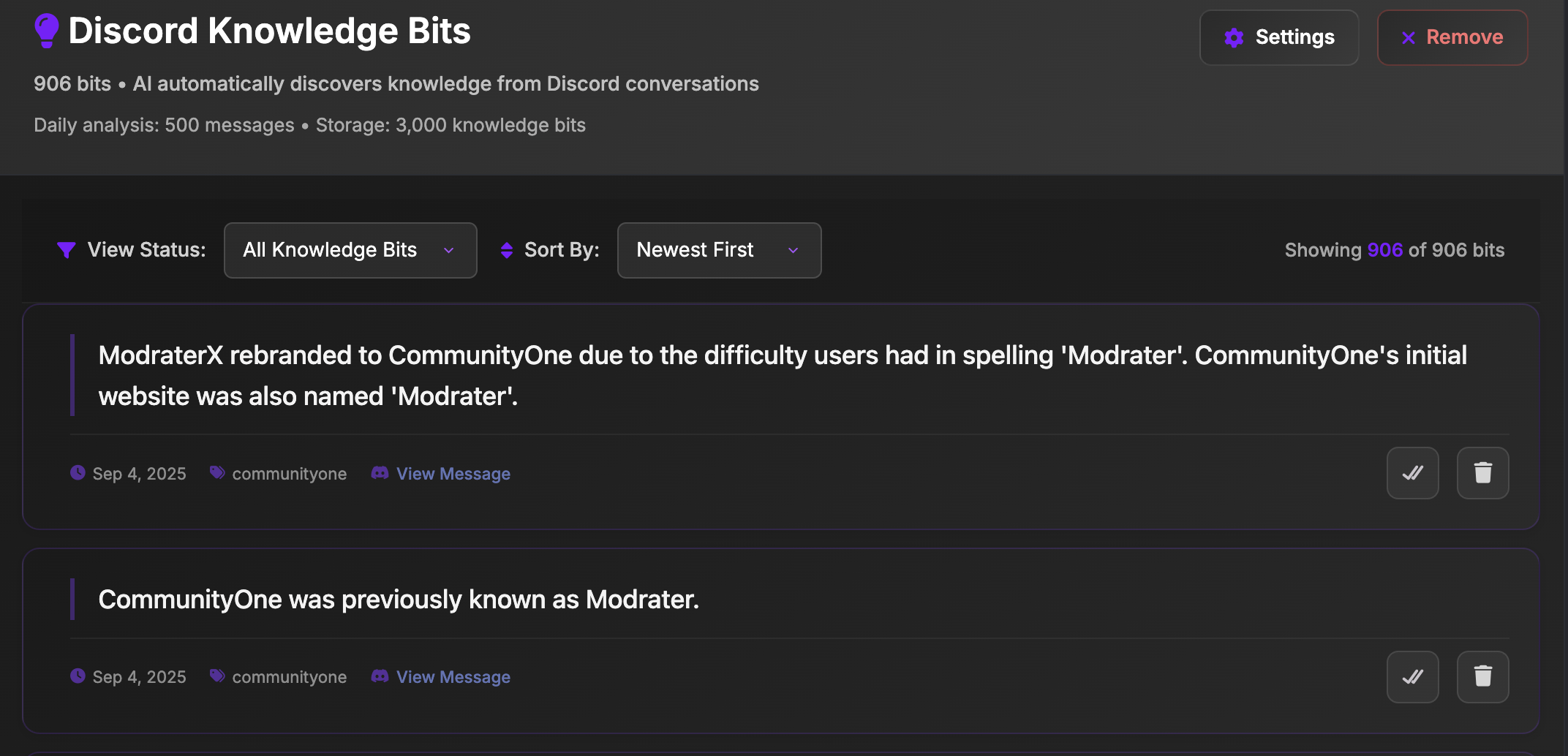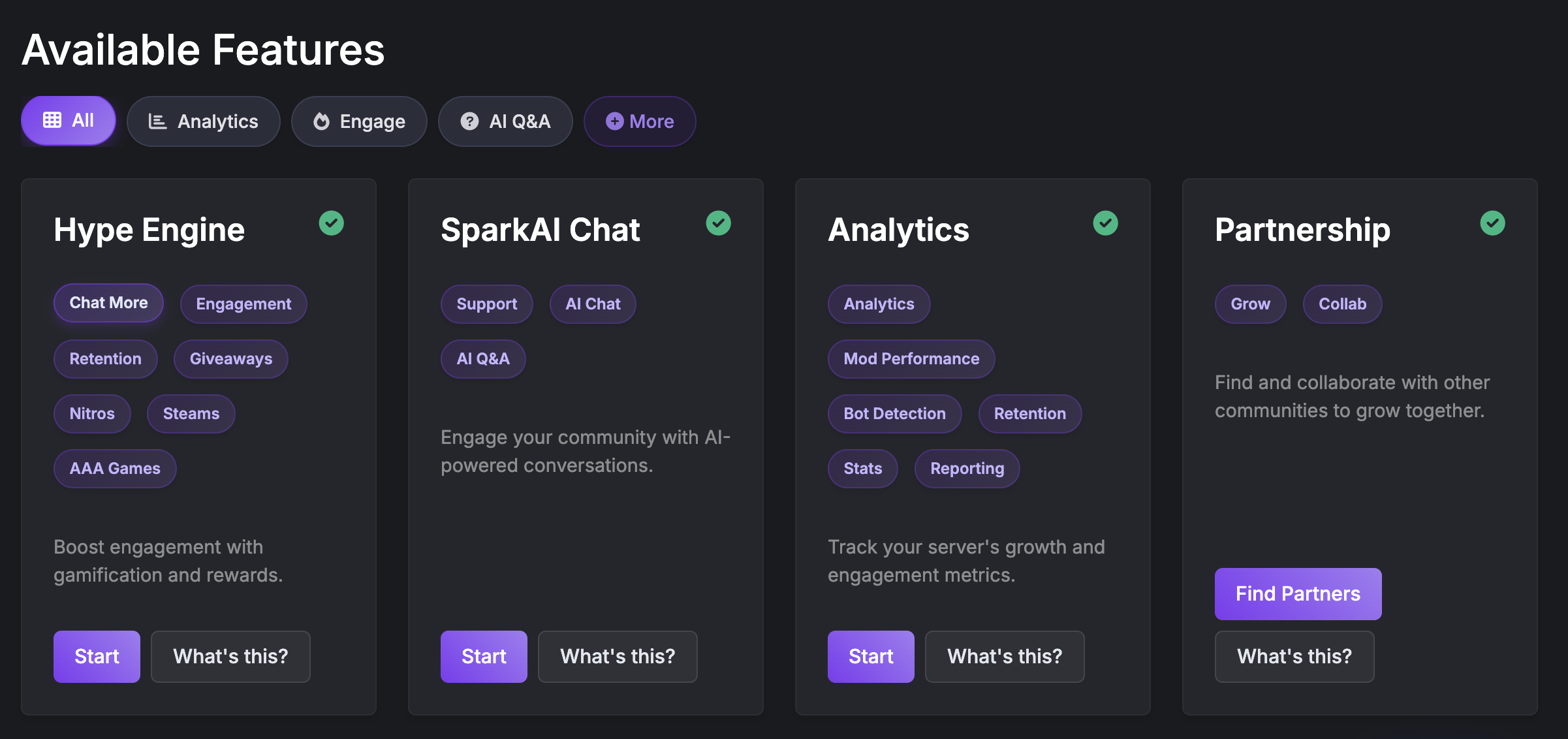 - Spark (AI Q&A Assistant): Using the bot’s Spark AI, CommunityOne can automatically answer member questions by learning from your server’s documentation, wikis, or FAQs. It’s like having a support rep who knows your community’s knowledge base inside-out. You can customize Spark’s personality and it will always provide on-brand, accurate answers (since it’s trained on your content, not just generic internet info).