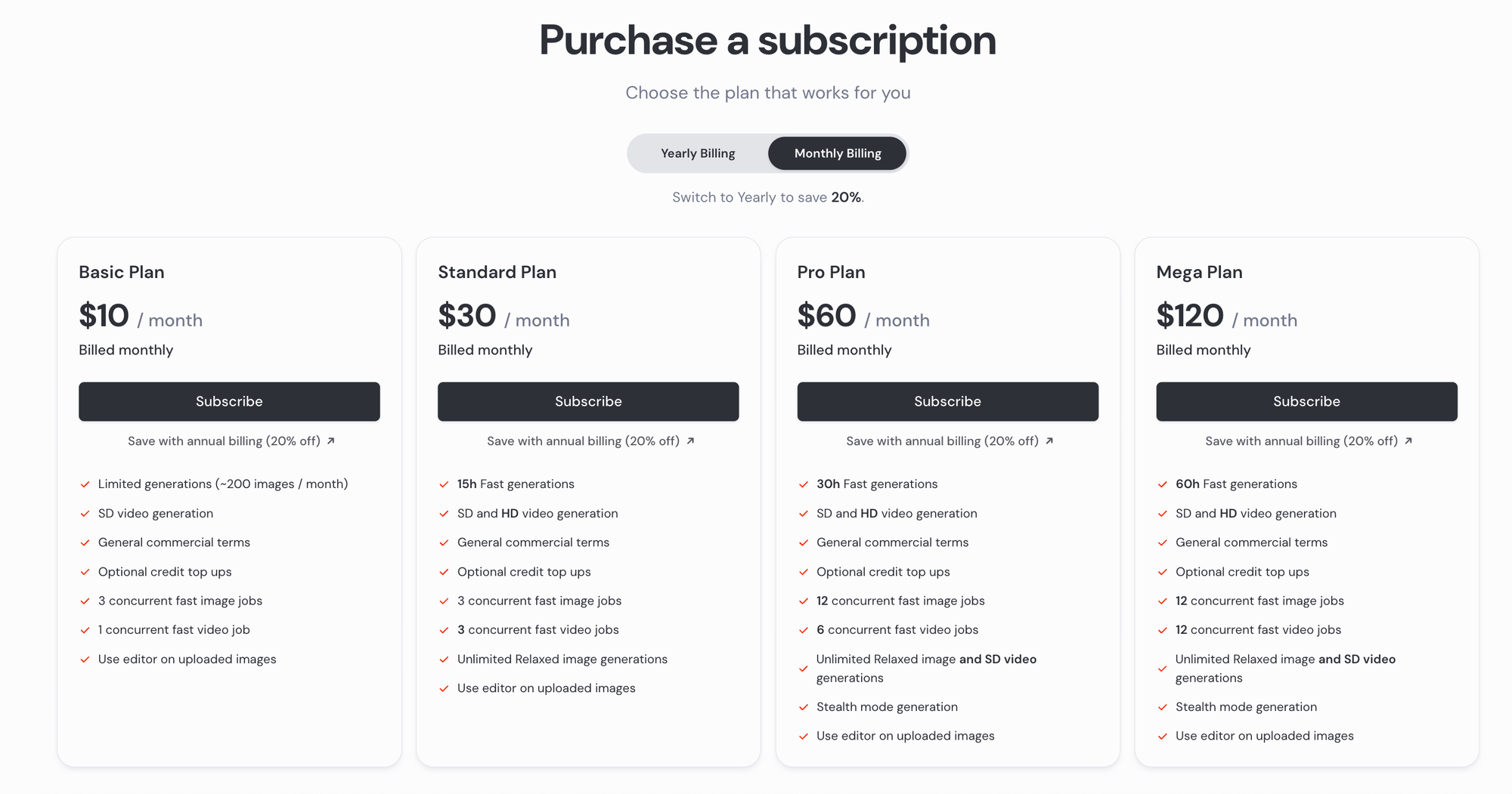 - Standard Plan – $30/month: This is often recommended as it offers unlimited image generations in relaxed mode (slower queue) and ~15 hours of Fast GPU time. You get essentially endless art at standard quality, plus the ability to do a reasonable amount with priority speed. Standard allows private generation (stealth mode) for an extra fee or if you choose annual billing it’s included.