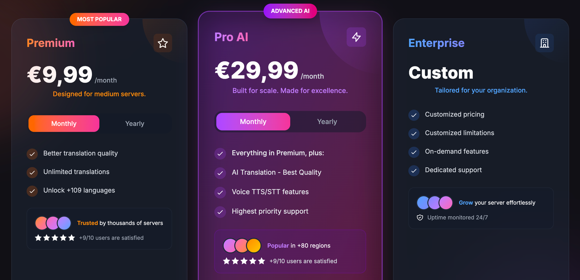 The bot offers a free plan that allows for daily translations, refreshed through actions such as voting on top.gg. For heavy users, the premium plan (around €9.99/month) unlocks unlimited translation capacity, faster processing, and higher accuracy engines. Premium users also get access to advanced usage stats and priority support. The free plan works well for small servers, but larger multilingual communities may quickly need a premium to avoid daily caps.