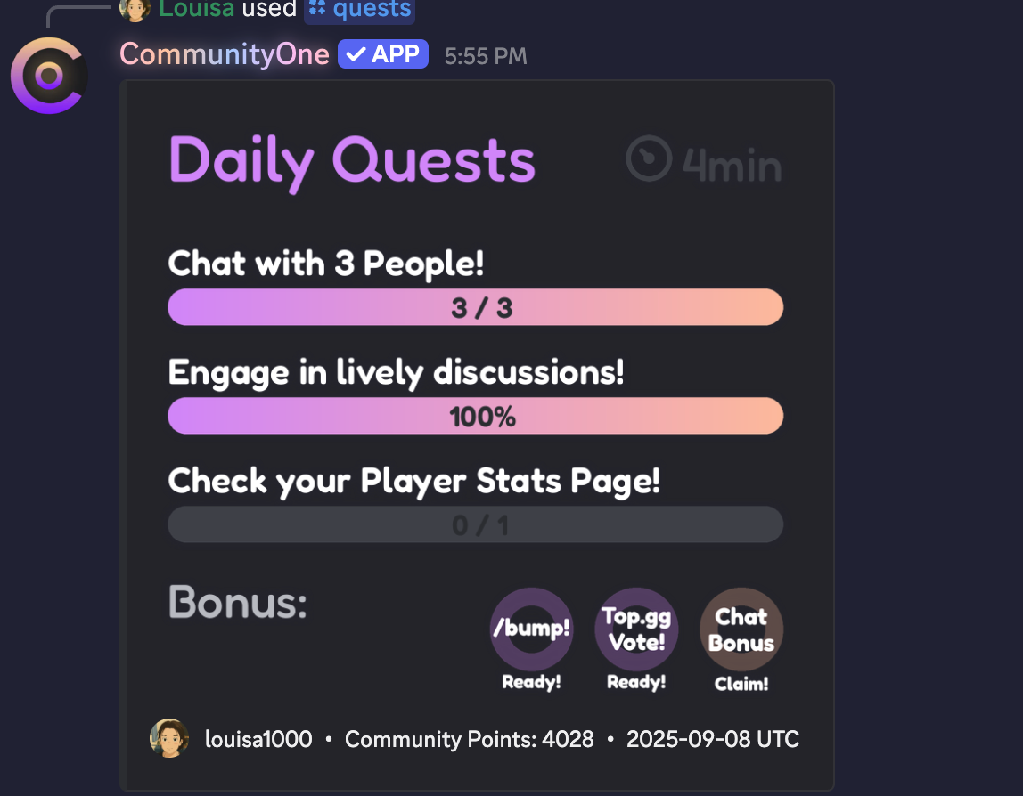 - Hype Engine (Gamified Quests): This unique feature creates personalized engagement quests and challenges tailored to each member. For example, it might set up fun daily tasks or trivia that encourage members to participate more. By rewarding participation and turning engagement into a game, Hype Engine can 4× your daily Discord activities. Plus, your members get raffle tickets for weekly giveaways, including free nitros and steam credits.