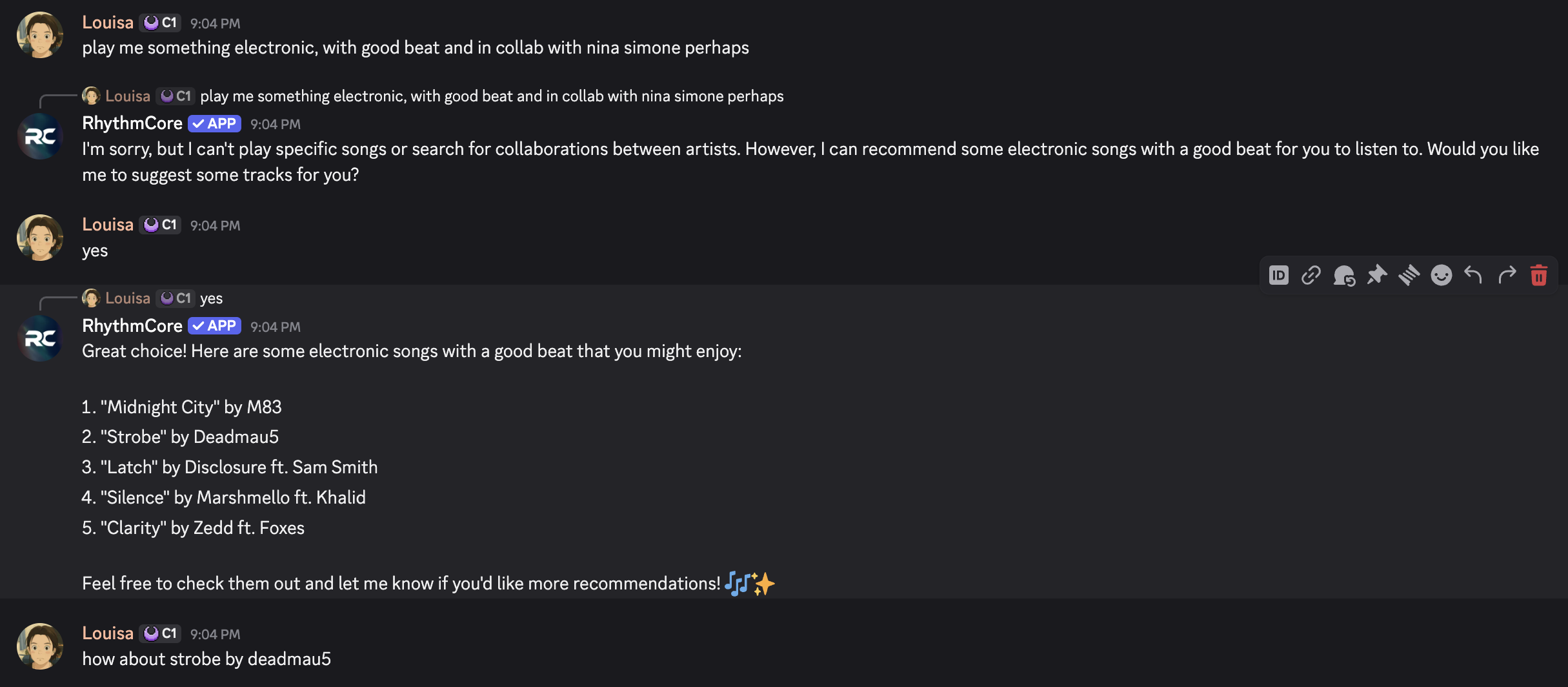 RhythmCore is one of our favorite AI bots because it embodies everything we believe in, specifically, how to utilize AI to build a better community. At its core, Rythmcore is a great Discord music bot, and it delivers THE BEST song quality. AI drastically changes the way your members select music to play, making it a lot more fun! However, at its core, it remains a great music bot that aims to connect members with music.