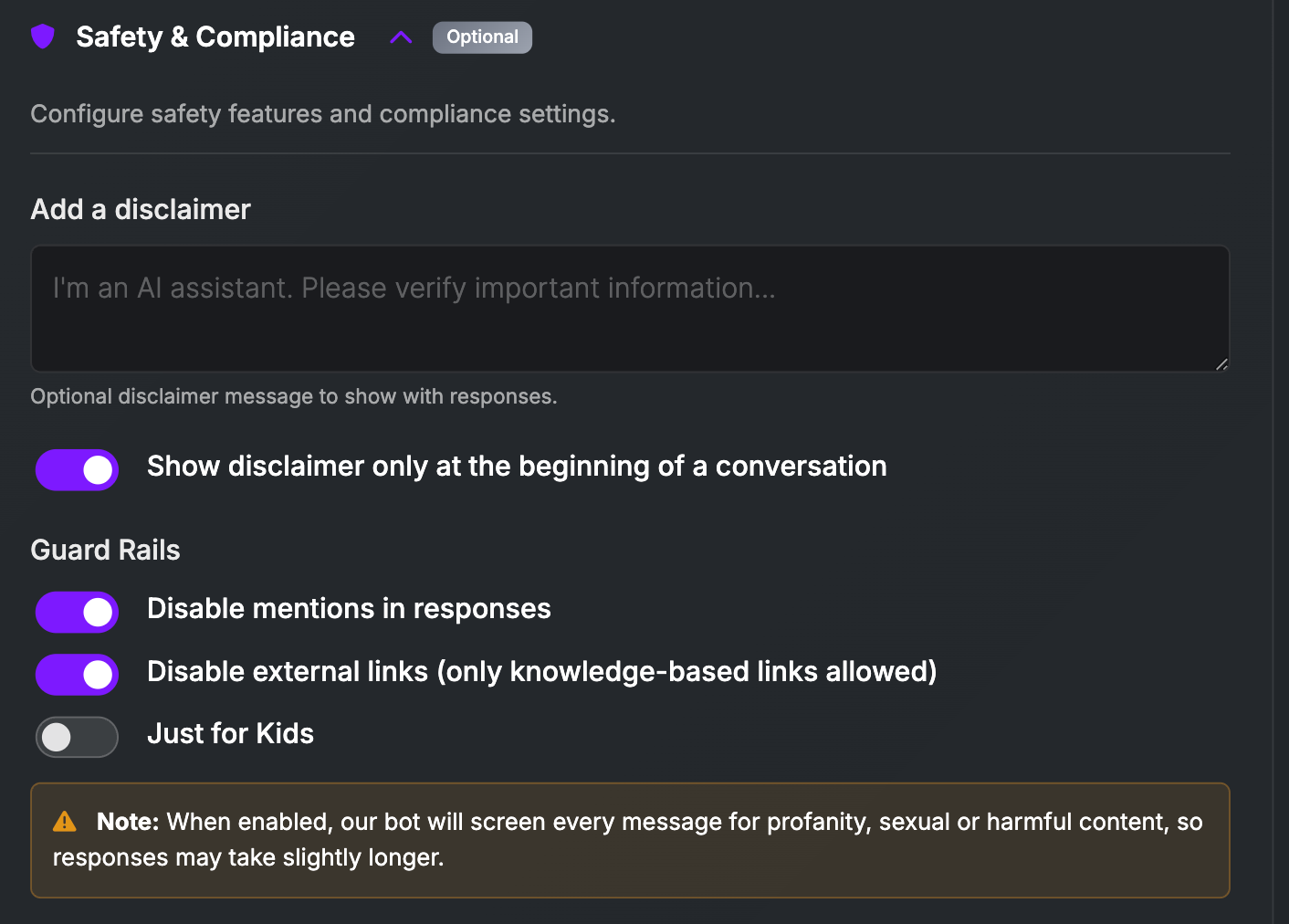 - Safety is not a concern. Most support-driven chatbots have built-in moderation. Since most are used in public settings, it is in the developer's interest to ensure that the content is safe for the general public. Moderations are more lenient for an engagement-driven chatbot, as the ultimate call-to-action is to bring their bot to a private chat or a private server with you alone.