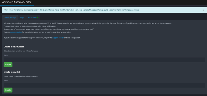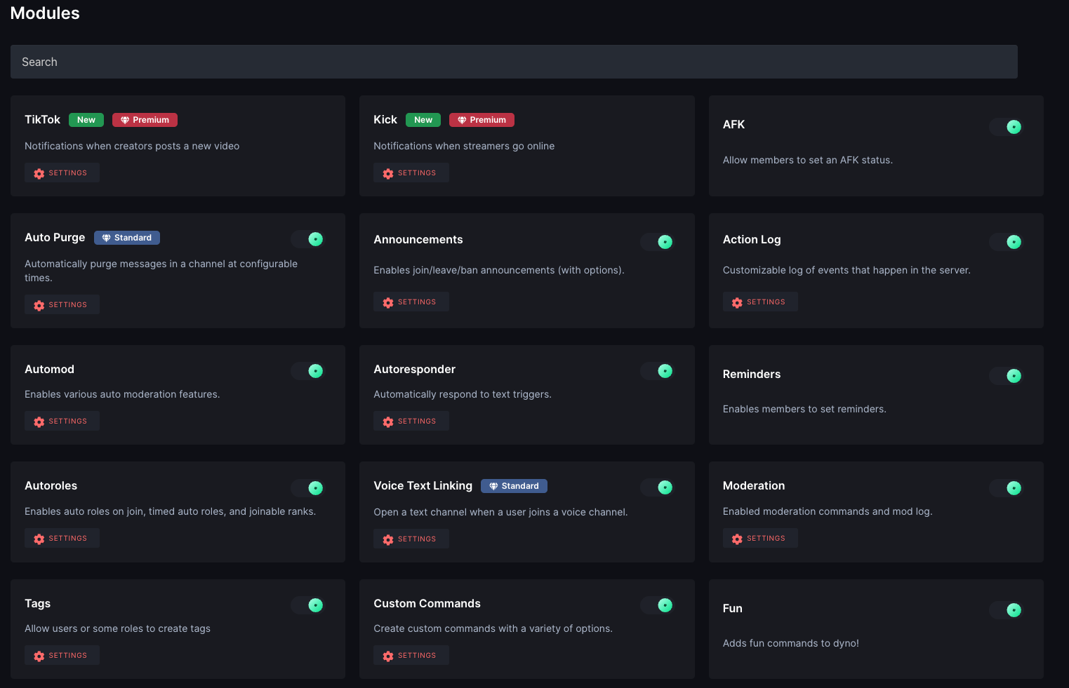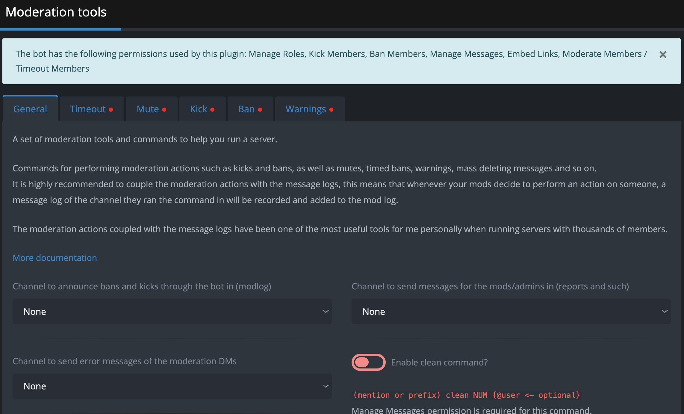 - Navigate through modules (Moderation, Auto Moderation, Roles, Notifications, etc.) and enable or disable features as needed.