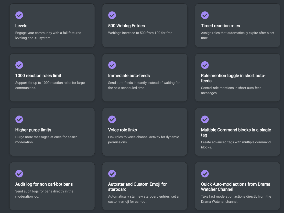 | Carl-bot | Servers that rely on reaction roles & suggestions | Reaction roles, automod, suggestion system | Free (basic), Premium from $7.99/mo |