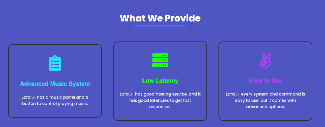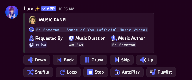 | Lara Music | Servers wanting 24/7 background music | Always-on music with button-based controls | Free |