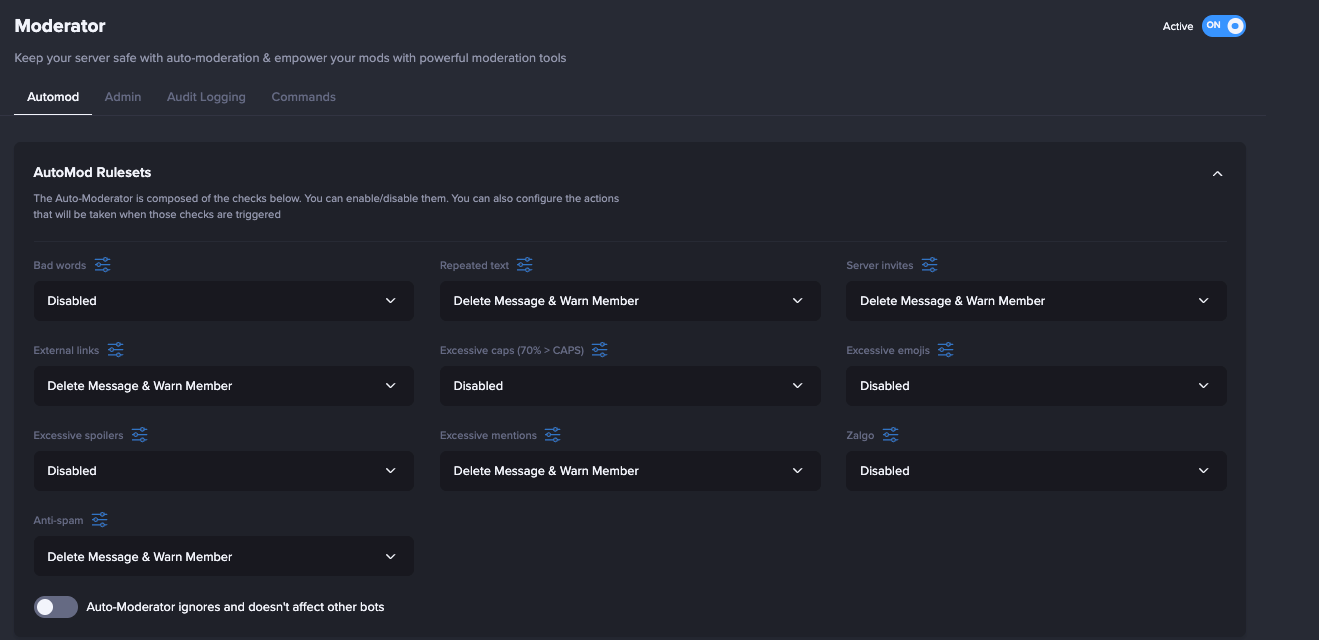 The bots in this section offer broad functionality and are suitable for most community servers. They combine moderation, automation and engagement tools in one package.