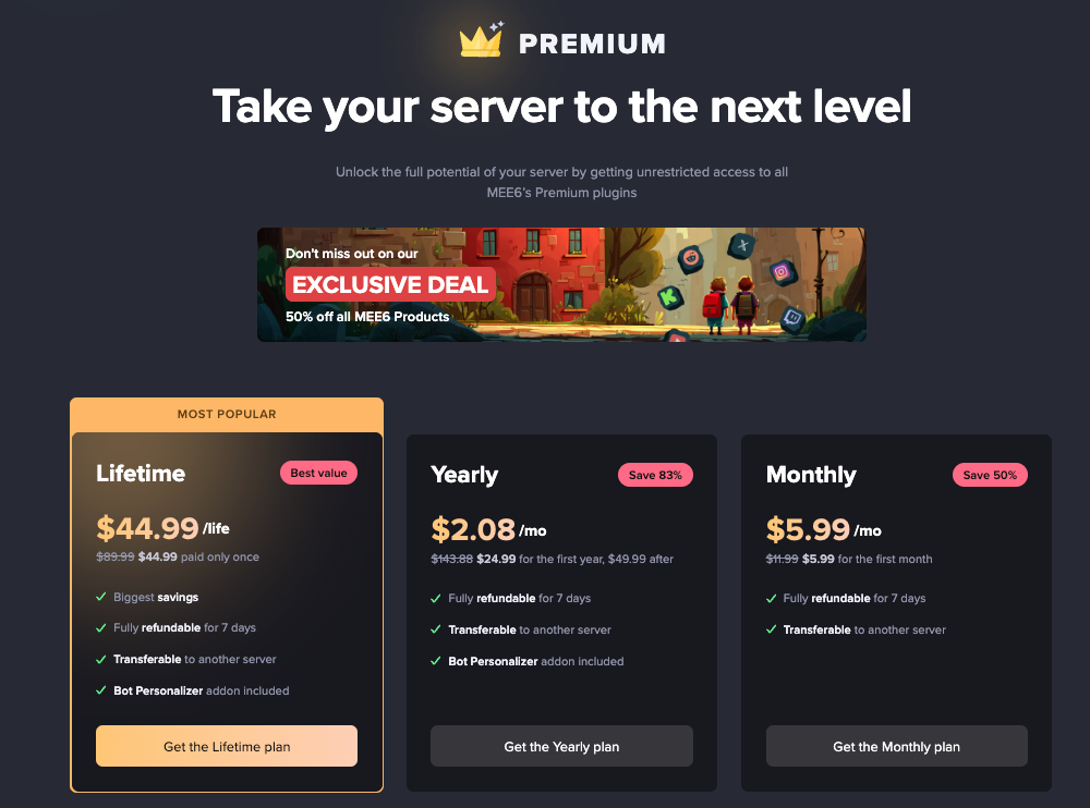 | MEE6 | Early-stage servers that want an all-in-one starter bot | Bundled features: moderation, leveling, auto-messages, role reactions, YouTube/Twitch alerts | Free (limited), Premium $11.95/mo or $89.90 lifetime |