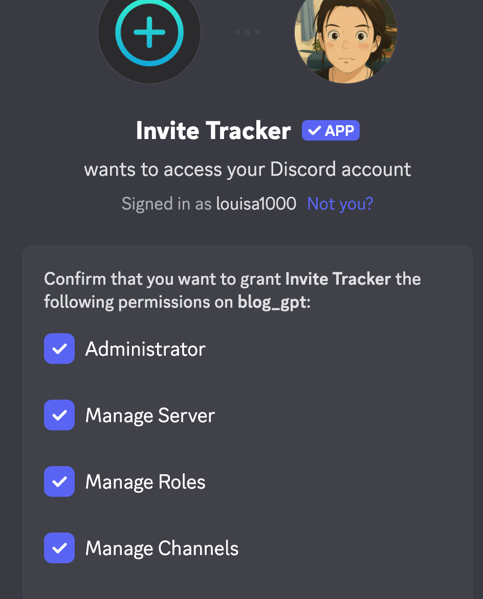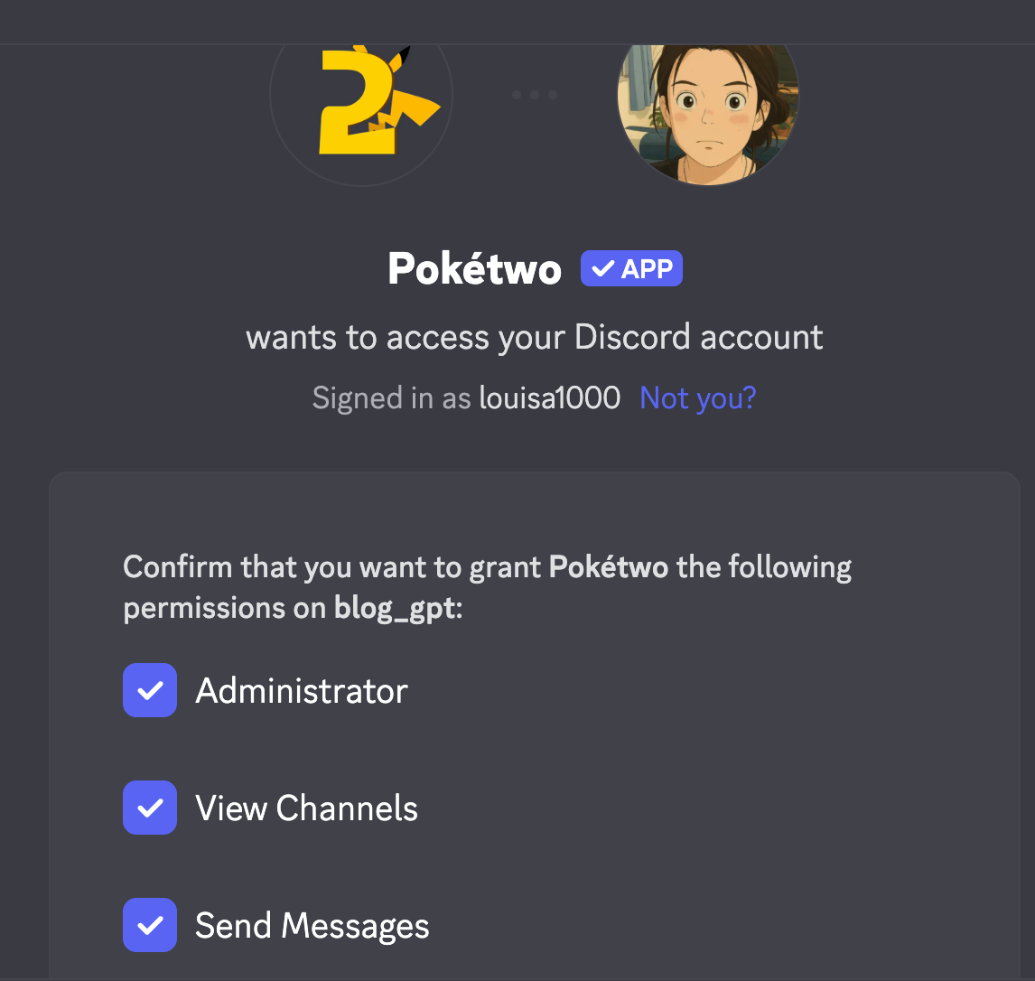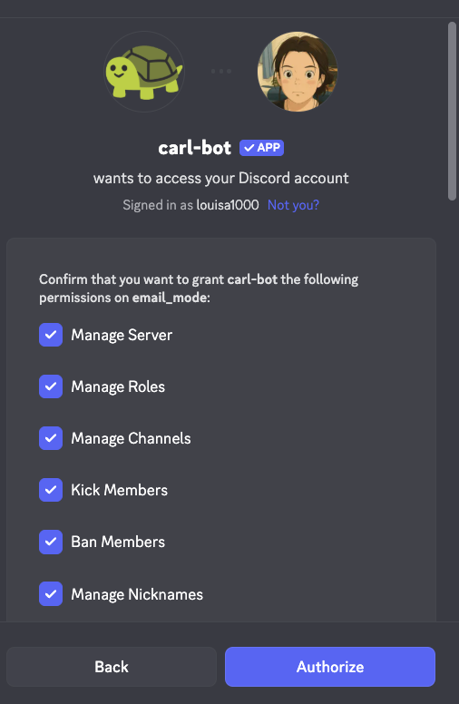 - Authorize the bot and select your server, granting the requested permissions (Admin, Manage Roles, Manage Messages, etc.).