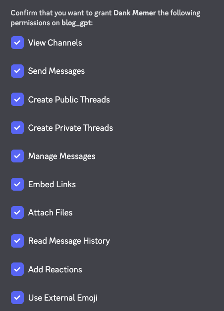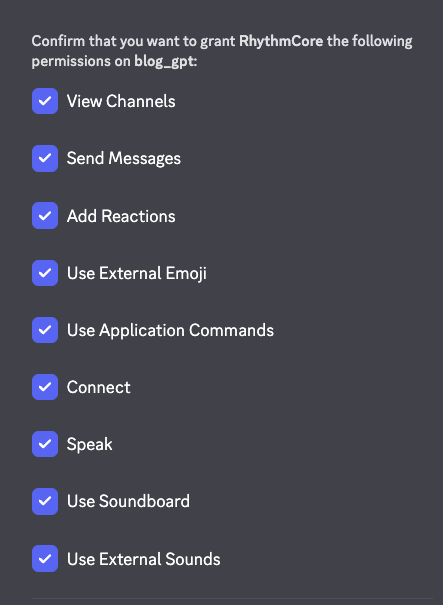 - Review the permissions the bot is requesting. Reputable bots only need permissions relevant to their functions (e.g., manage messages for moderation, connect/speak for music bots). Uncheck any unnecessary permissions. Try to avoid giving any server admin permission except for security related bots.