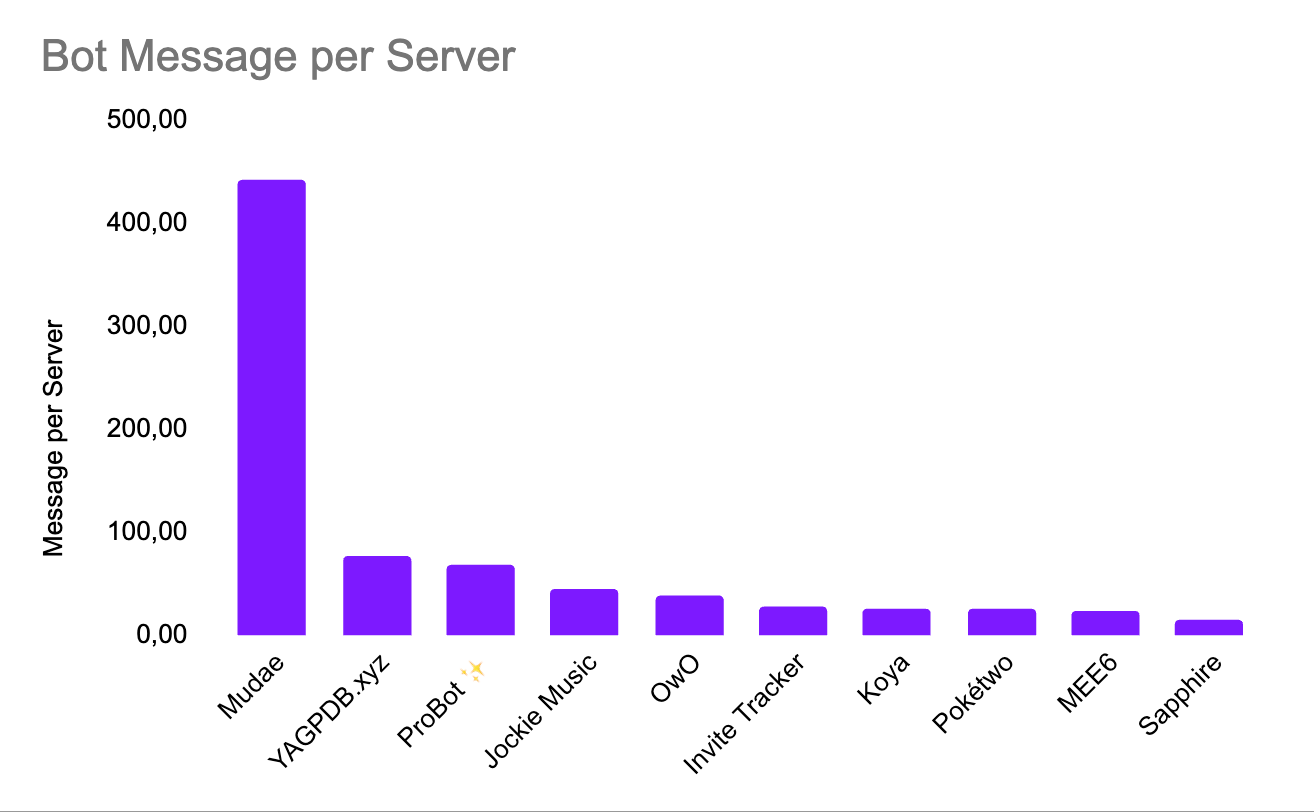 Bot Messages per Server (Activity Level): Installation alone doesn’t tell the full story, so we also measured how actively each bot is used by looking at the average number of messages the bot posts per server. The chart above highlights that Mudae far outpaces others in messages sent, showing it’s heavily engaged by users (with frequent game interactions). YAGPDB, ProBot, and Jockie Music also show high messages-per-server, meaning they perform many tasks or interactions in each community. A bot that sends more messages on average is likely being used regularly for moderation logs, games, or commands – a strong indicator of an actively useful bot. By combining these two metrics – how many servers use a bot and how busy that bot is in each server – we focused our guide on bots that are not only popular installs, but also proven to deliver steady value through active usage in real communities.