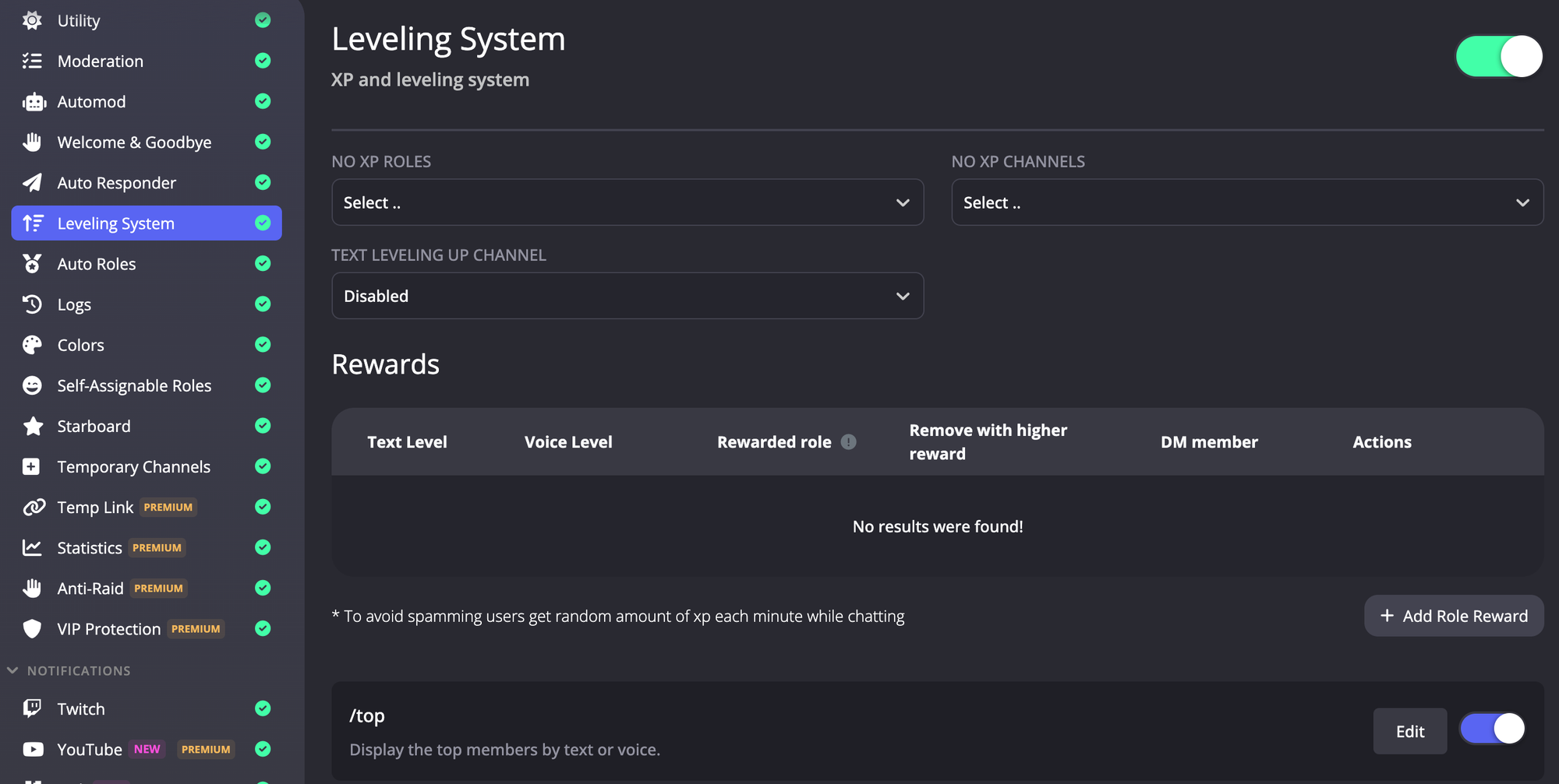 ProBot’s leveling system and economy features are similar to other multi-purpose bots: members earn XP for chatting to level up, and you can configure role rewards for participation. It even has fun social commands (like generating memes or random jokes), making it an engaging general-purpose bot.
