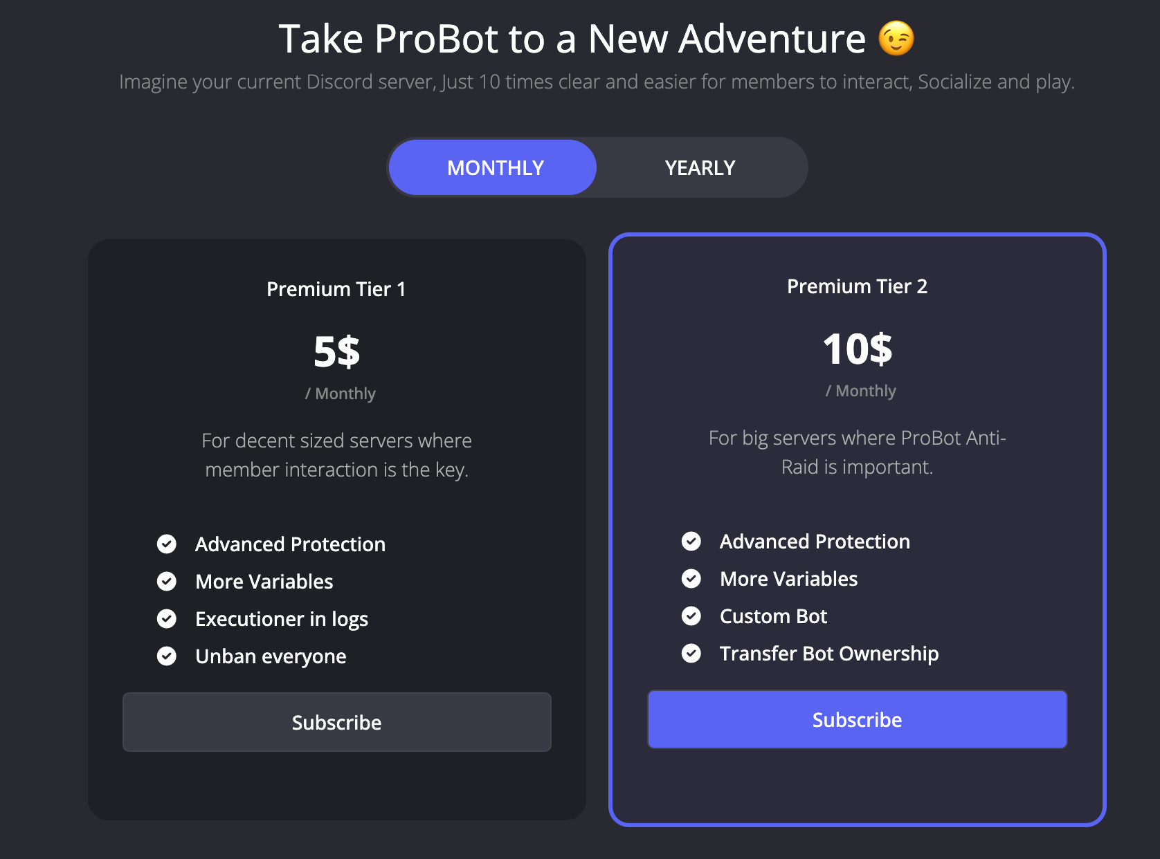 Despite offering so much for free, ProBot does have premium tiers that unlock even more. Premium primarily increases limits (for example, more auto-response slots, higher quality music playback, and an anti-raid protection toggle for big communities). However, the free tier is generous enough for most medium-sized servers.