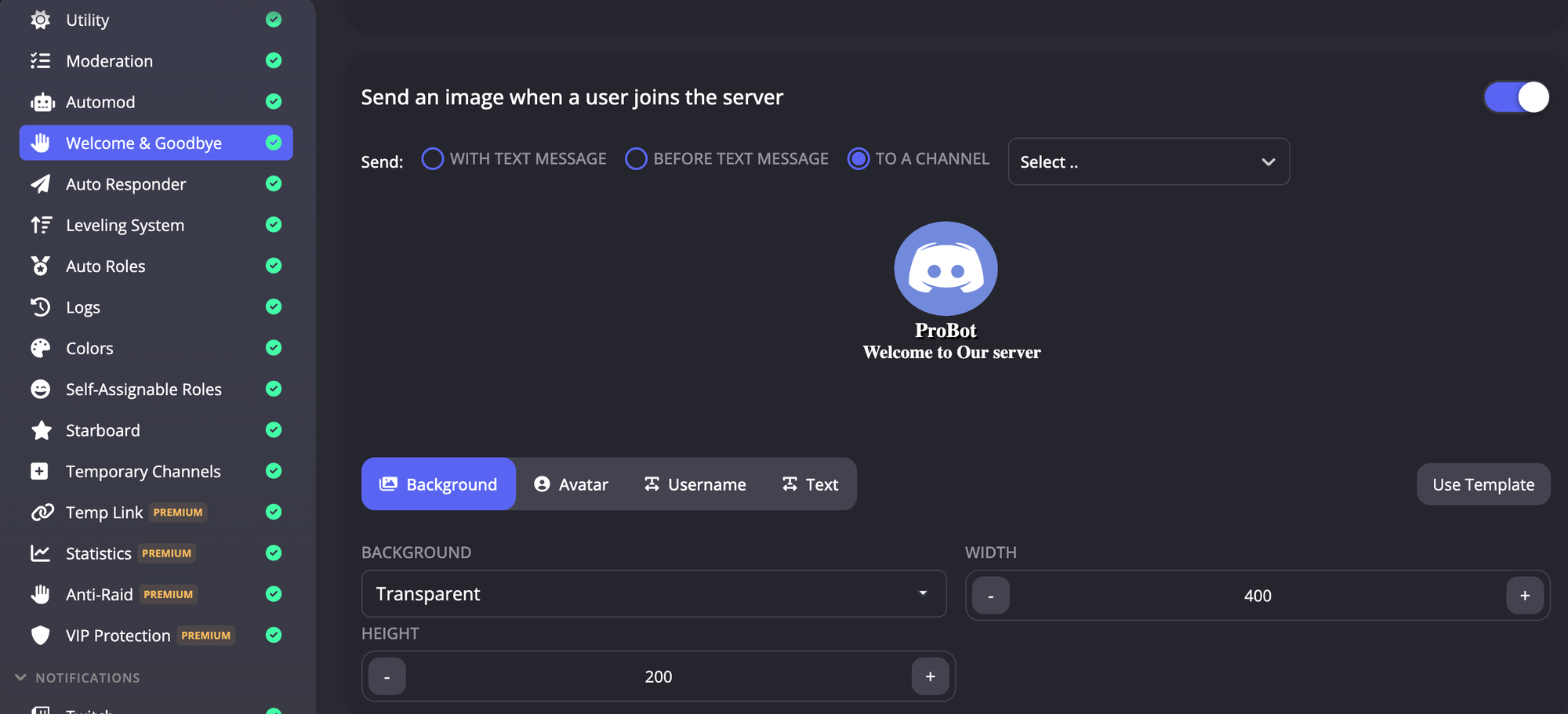Where ProBot truly shines for community growth is its welcome module. You can design welcome images with the new member’s username and avatar embedded, choosing from templates or adding your own background. A personalized welcome card posted in your channel helps newcomers feel recognized immediately. You can also set custom welcome and leave messages, giving your server a friendly, on-brand first impression. For example, ProBot might greet a user with a colorful image that says “Welcome, @User!”—something far more eye-catching than a default text message.