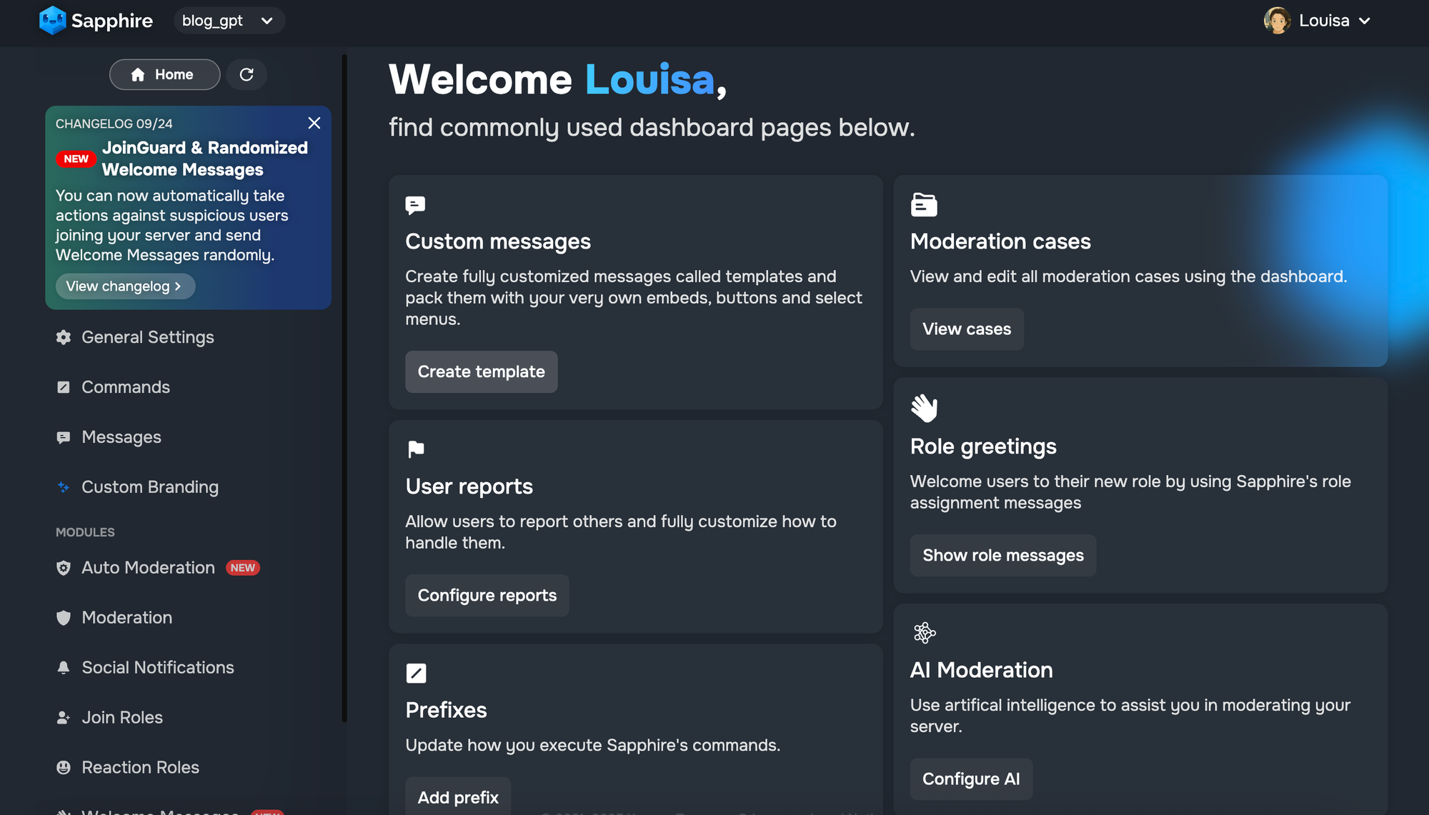 One of Sapphire’s key strengths is its customizability. Nearly every message the bot sends can be tailored via its web dashboard, allowing server admins to maintain a consistent style and tone. This means your welcome greetings, moderation alerts, and other bot outputs can be edited to fit your community’s personality. For servers that want a personalized touch or operate in multiple languages, this flexibility is invaluable.