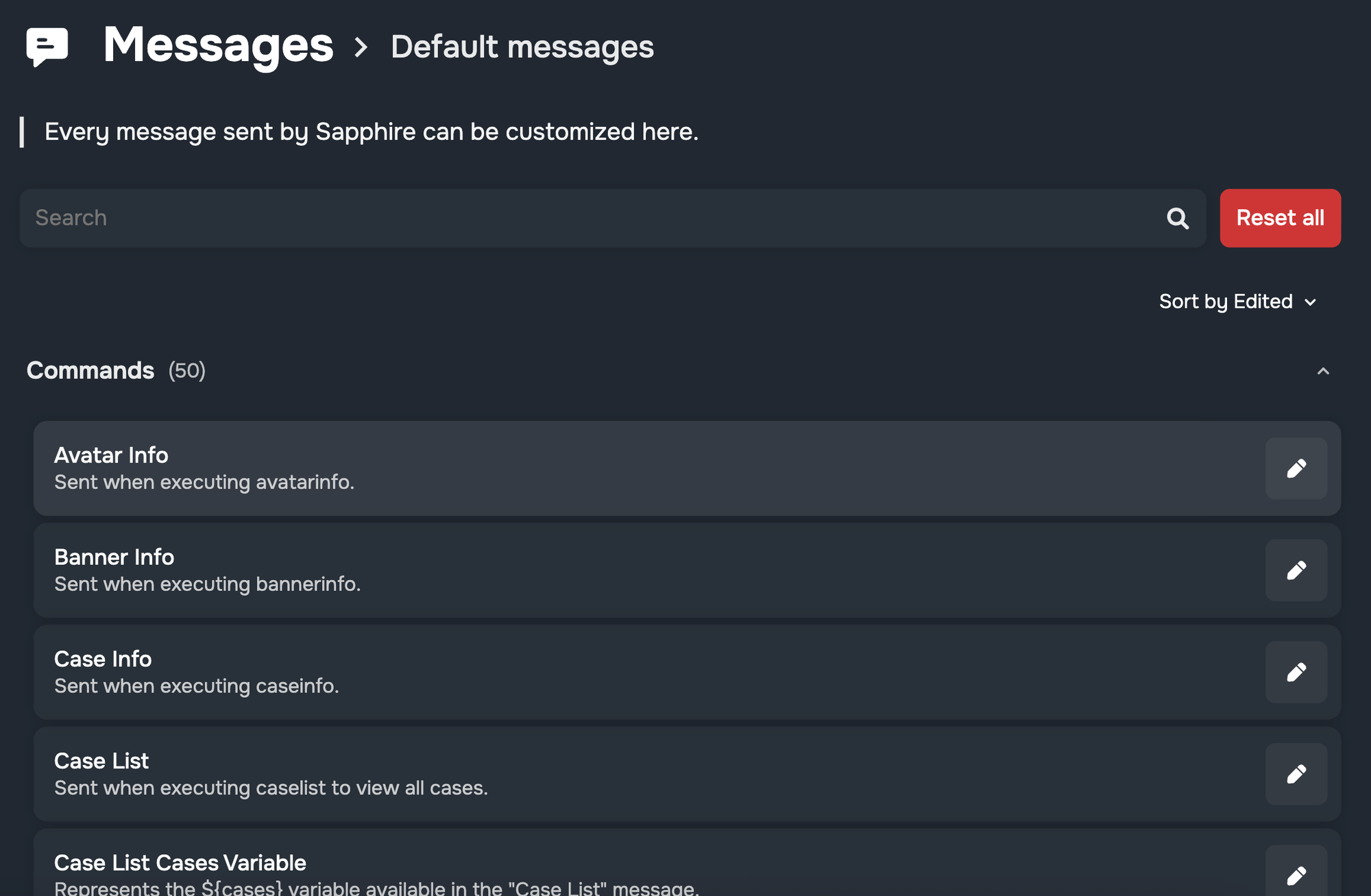 - Customize messages under the Messages -> Templates section: you can edit the text Sapphire uses for mod logs, warning messages, etc., to perfectly fit your server’s style.