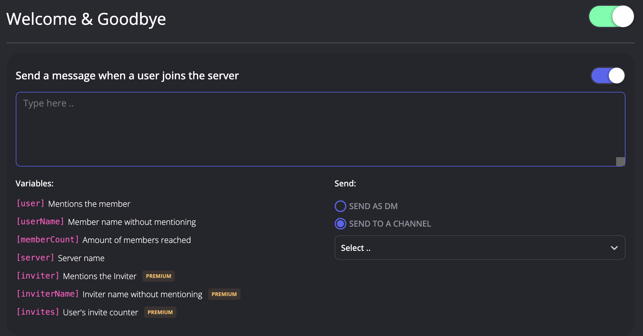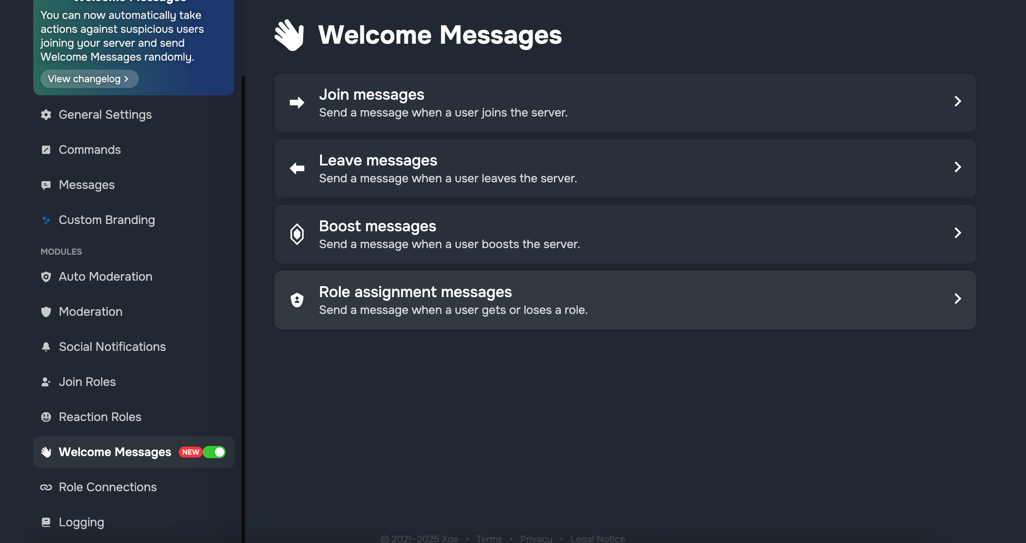 - To setup welcome messages (one of the most used features per our data), go to Welcome Messages and customize your messages.