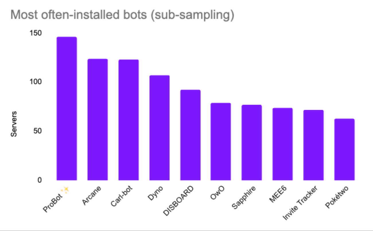 Most Often-Installed Bots (Subsample of Discord Servers): We based our “best bots” selection on proprietary data from a broad range of actual Discord servers (web3, gaming, anime, social etc), rather than just opinions. Using a statistically significant subsample of servers, we identified which bots are installed most frequently. The chart above shows the top bots by how many servers have added them — with ProBot, Arcane, Carl-bot, and Dyno leading the pack in popularity. These bots appear in a large fraction of servers in our sample, indicating their broad appeal and trust within the community.