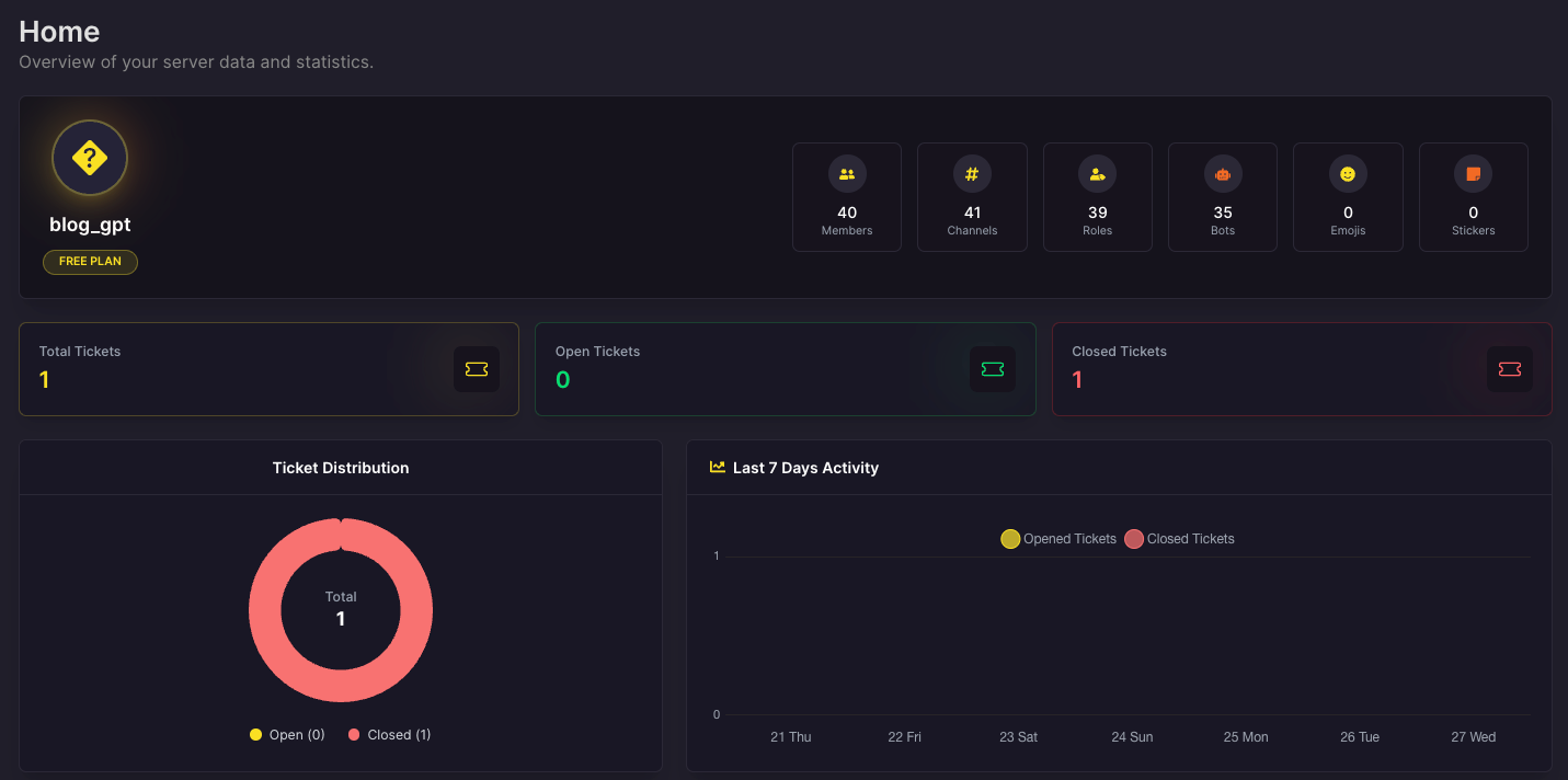 Extensibility: As an open-source solution, Discord Tickets can be customized if you self-host. Developers can add integrations or tweak how it works by modifying the code. This makes it attractive for those who need a custom workflow or want to integrate the bot with internal systems (like linking tickets to a GitHub issue tracker, etc.).
