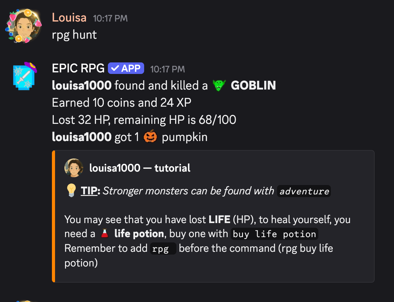 rpg huntor/hunt– Go on a hunt for monsters (basic grind for XP and coins)