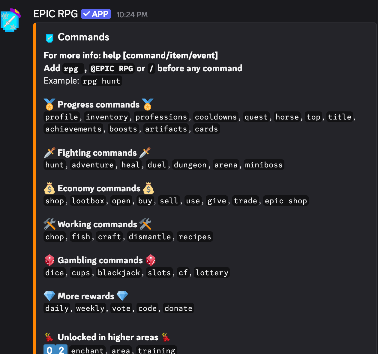 | EPIC RPG | Text RPG Adventure | Explore 20+ dungeons, fight bosses, craft items, PvP battles, prestige system. Addictive grinding loop with long-term progression. Multi-language support (EN, ES, PT). |