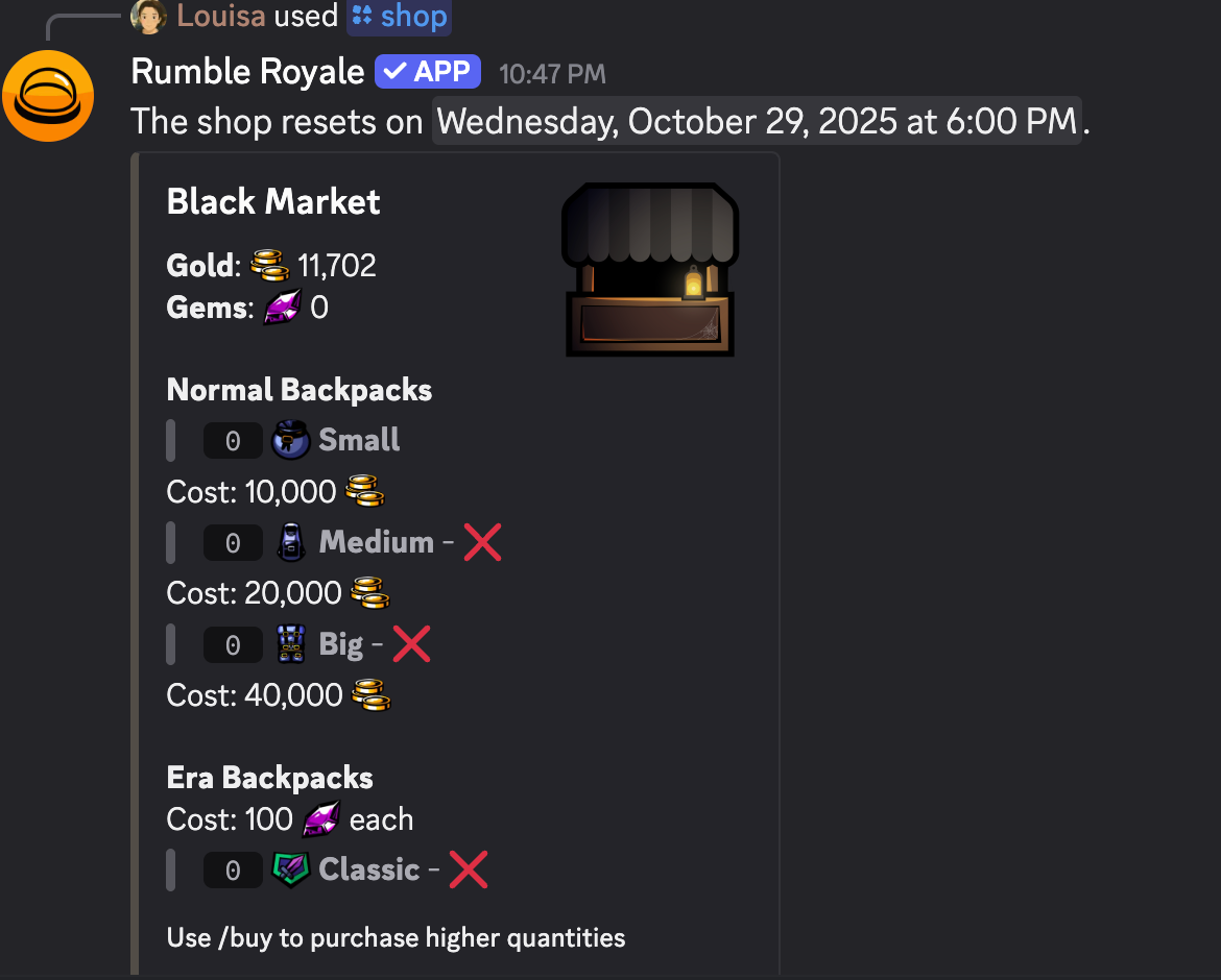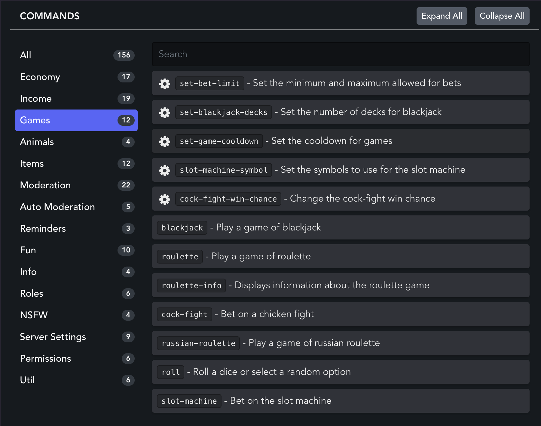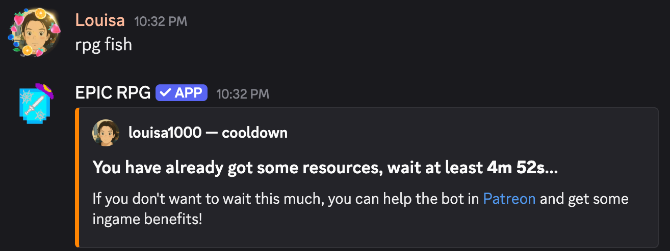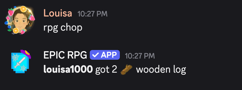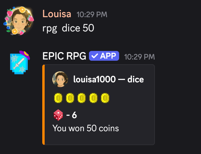 rpg dungeon– Attempt the next dungeon boss with your friends.rpg chop/fish/mine– Gather resources like wood, fish, minerals.rpg craft– Craft new equipment if you have the required materials.rpg duel @User– Challenge another player to a PvP fight for rewards.rpg shop/buy/sell– Check the item shop and manage your inventoryrpg dice 50– Wager 50 coins in a dice roll gamble (many casino-style commands available).