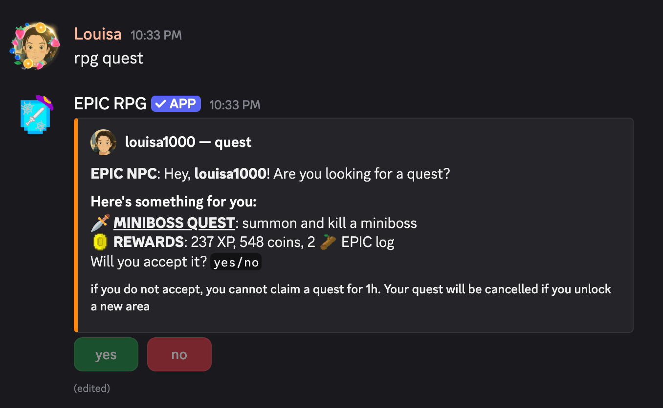 EPIC RPG is a text-based roleplaying game bot for Discord that blends adventure and economy elements. Players grind for experience and loot by fighting monsters, completing quests, and progressing through dungeons. The gameplay is simple but addictive: you level up your character, acquire swords and armor, and challenge dungeon bosses to unlock new commands and areas. With support for multiple languages (English, Spanish, Portuguese) and a dash of humor, EPIC RPG offers a fun RPG experience entirely through chat commands.