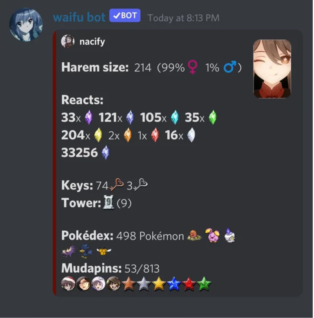 Many Discord communities are centered around roleplaying (RP) or specific fandoms (anime, manga, etc.). There are fun bots tailored to these interests as well. In anime/gaming fandom servers, collectible character bots are extremely popular – we already mentioned Mudae and Karuta, which let users “claim” their favorite characters and build collections. These inspire a lot of trading and excitement when a rare character appears.