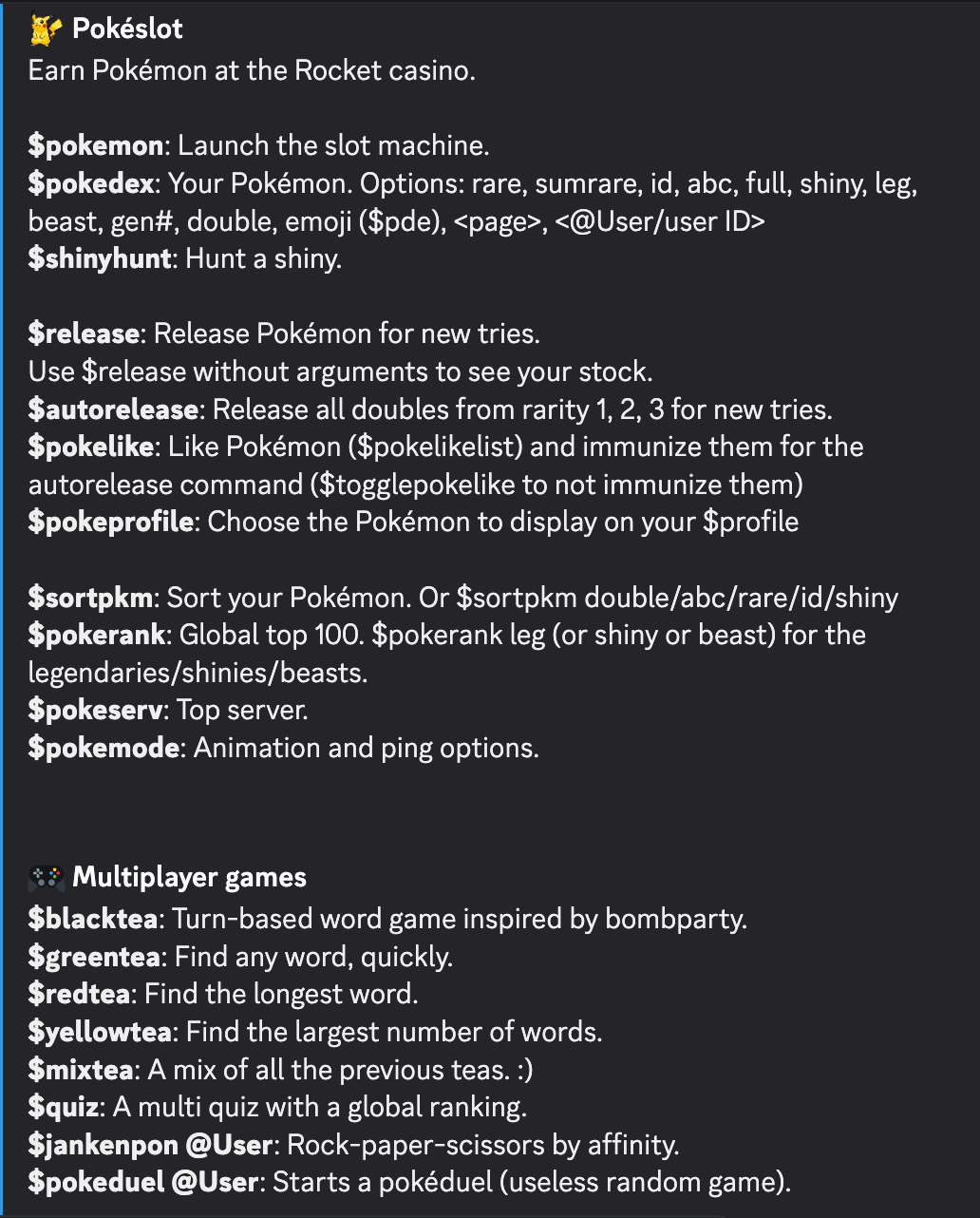 | PokéTwo | Pokémon Catching | Catch, collect, and battle Pokémon directly in chat. Features evolutions, trading, PvP battles, and shiny hunting. A must-have for nostalgic or Pokémon-themed servers. |
