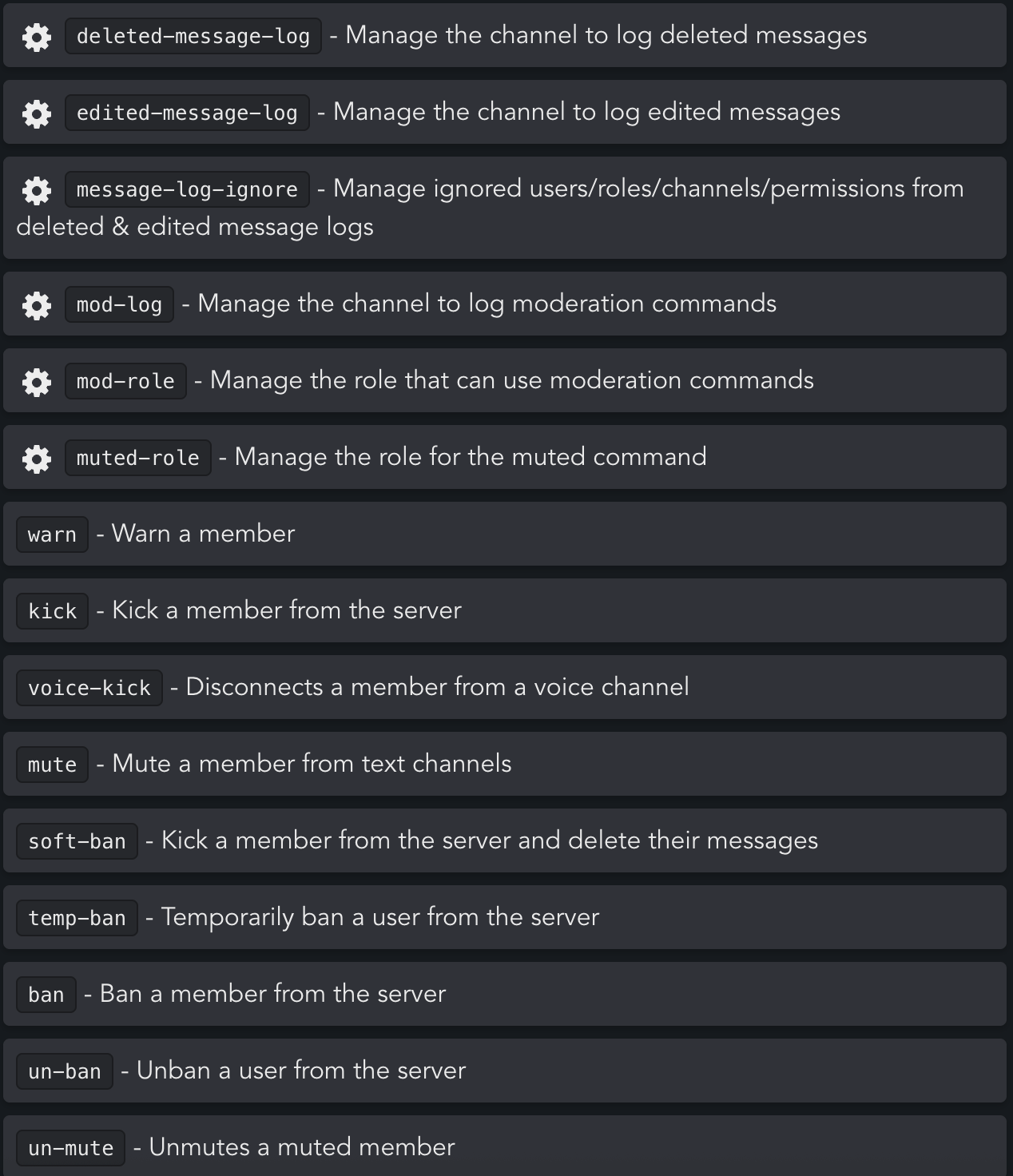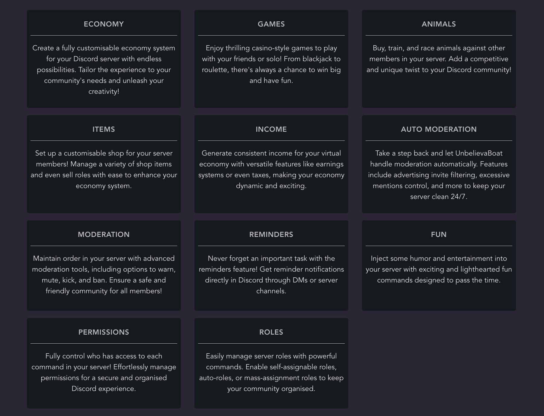 | UnbelievaBoat | Economy + Games | Full economy system (earn coins from games, gambling, etc.). Jobs, bank heists, item shop, leaderboards. Also has fun mini-games and some moderation features. |