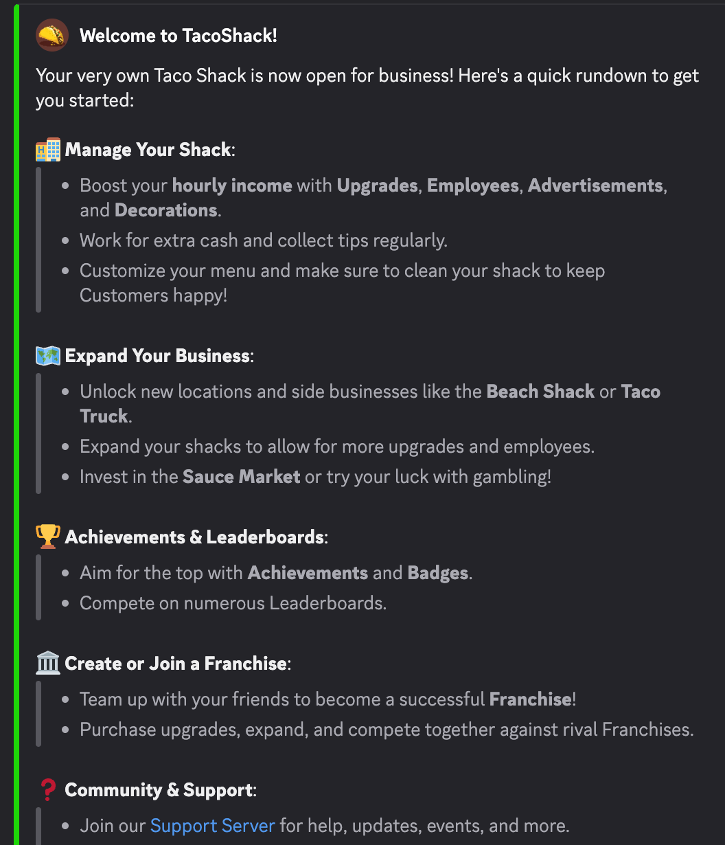 Why They’re Fun: Dank Memer stands out for its humor – it can pull random Reddit memes or make custom “dank” images on the fly, keeping everyone laughing. Its economy is just for fun (no real money) and includes amusing jobs (begging, crime, etc.) with a chance of funny outcomes (you might get “mugged by a raccoon” when using the pls crime command, for example). Both CommunityOne Hype Engine and UnbelievaBoat is great if you want a more “gamified” economy with moderation integration – it’s often used to reward activity with coins & points. TacoShack and others are more specialized but can be addictive for the right crowd.