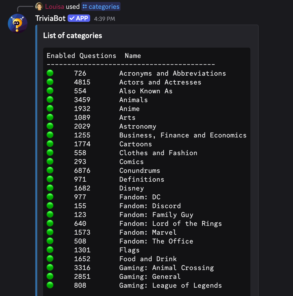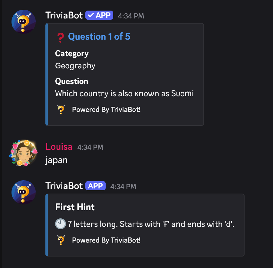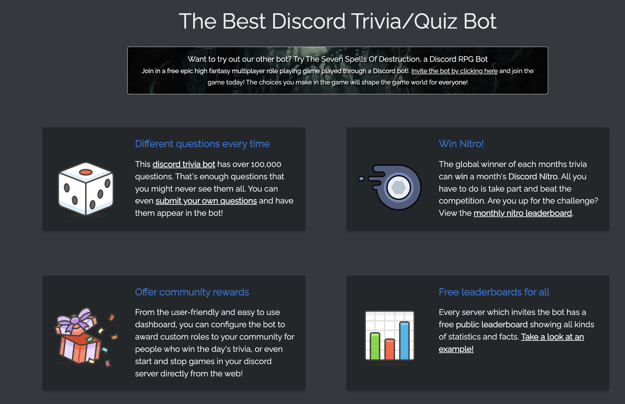 Want to host a trivia night or challenge your server’s knowledge? Trivia bots are perfect for that. These bots ask questions (from general knowledge to niche topics) and players answer in chat, competing for points. Trivia bots provide an easy, engaging way to spark friendly competition and get people talking. Many support team play and leaderboards, so you can even run weekly trivia contests.