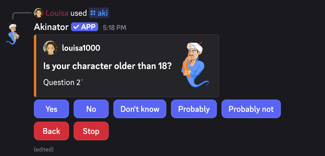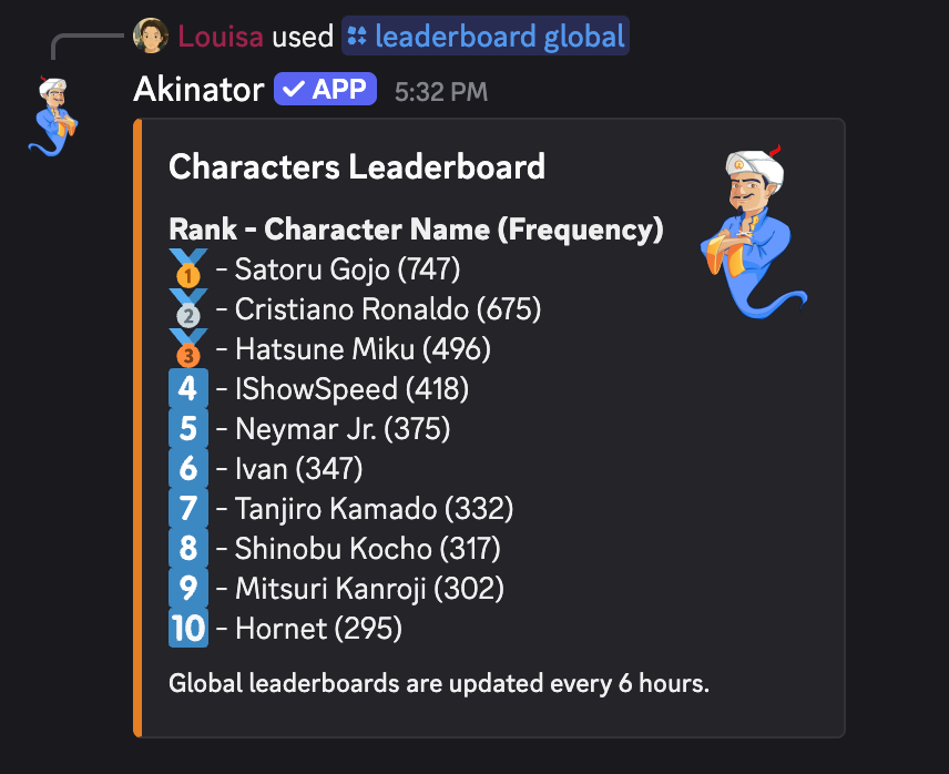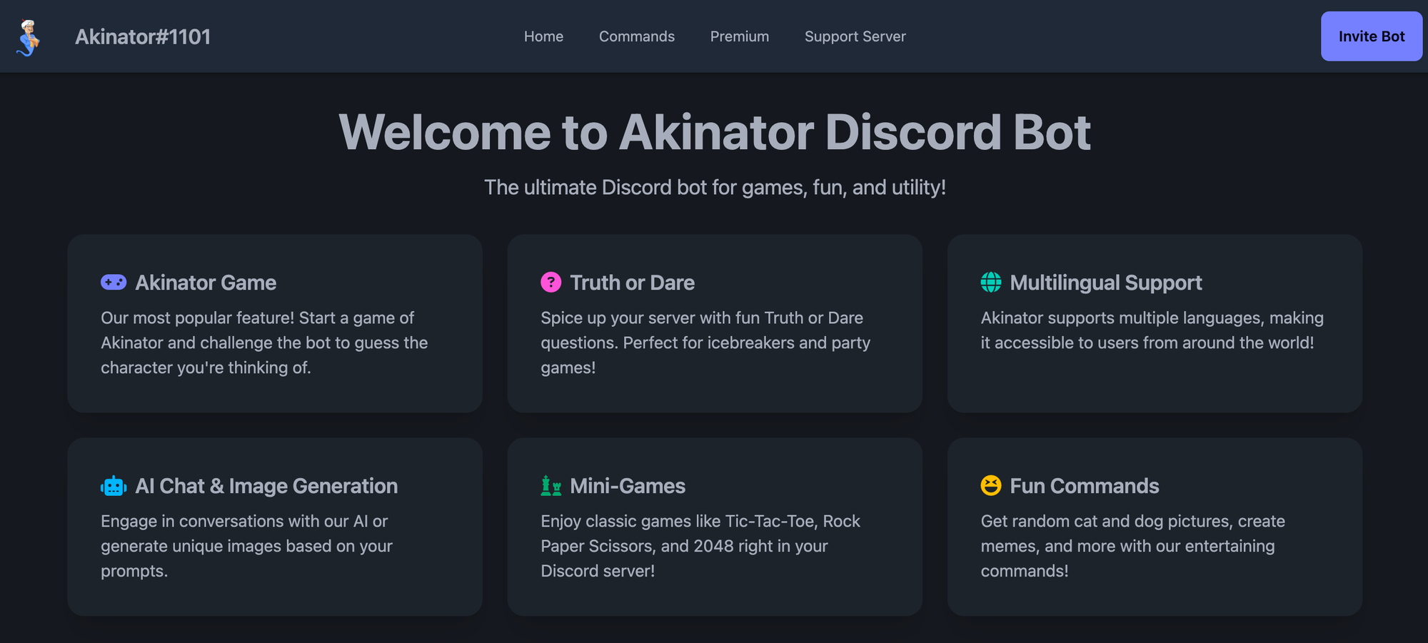 | Aki (Akinator) | Guessing Game | Plays the “Akinator” game – the bot tries to guess the character or person you’re thinking of by asking questionstournova.games. A fun 20-questions style game for all ages. Surprisingly accurate and entertaining. |