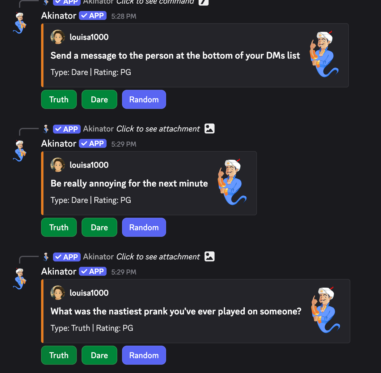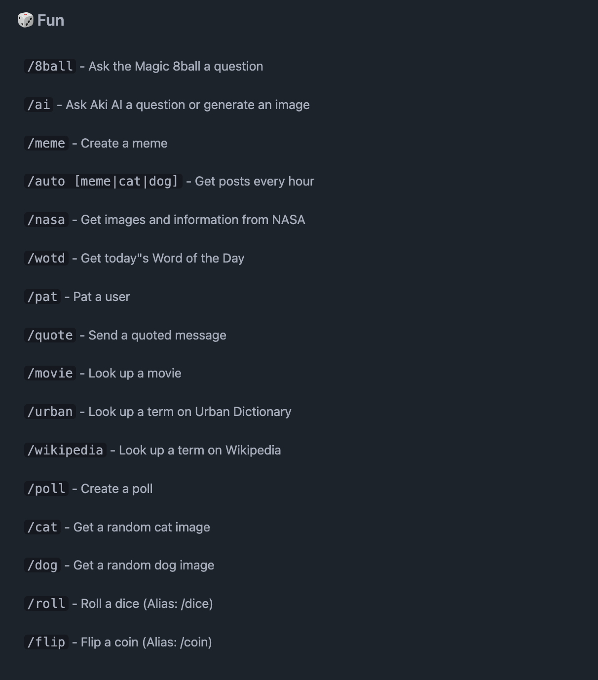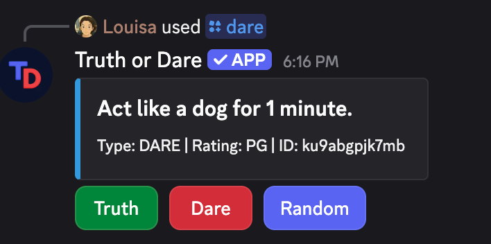 /truth– The bot gives a truth question. E.g., “Truth: What’s the most embarrassing thing that ever happened to you at school?” The idea is whoever triggered it or someone designated must answer honestly./dare– The bot gives a dare. E.g., “Dare: Sing the chorus of the last song you listened to out loud.” The person must perform the dare.