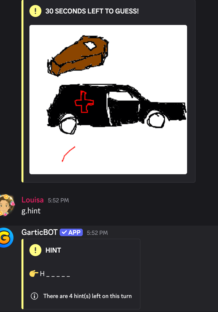 g.gartic– A common command to start the game in the channel. Simply typing this might initiate the first drawing. (The prefixg.is inferred from “garticbot.gg” instructions. Some bots might use a slash command like/gartic startnow).g.hint– If no one can guess for a while, the bot might automatically or upon command provide a hint (like fill in some letters of the word). Some implementations reveal letters as time passes. There might be a command or automatic triggers for hints.