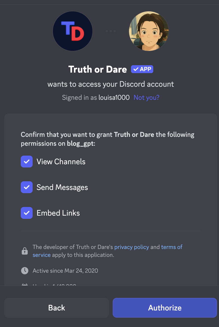 - Invite the Bot: Use the provided invite link (e.g., truthordarebot.xyz or a bot list) to add it. It should need permission to send messages and embed links (some prompts might be long or in embed format). No need for admin privileges beyond that. Once invited, it might DM a quick start or just be idle until called.