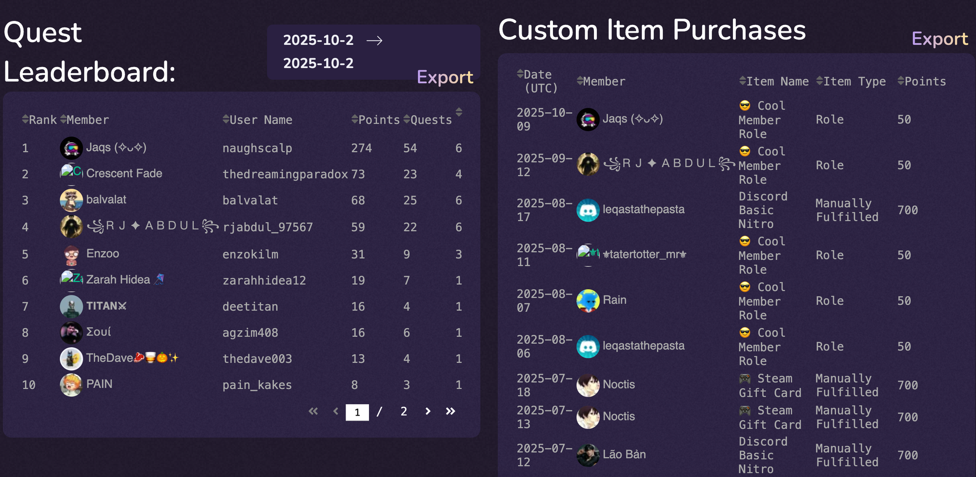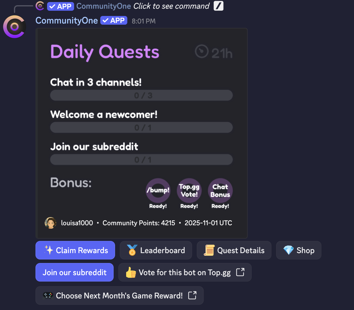 | CommunityOne (Hype Engine) | Engagement + Quests + Analytics | Smart quest system that turns Discord engagement into gamified “missions.” Daily and custom quests 🧩, AI-driven personalization, built-in reward shop, and analytics dashboard. Helps servers boost retention (10×), chats (4×), and new-member activation (2×). Ideal for creators, Web3 projects, and brand communities that want sustainable engagement. |