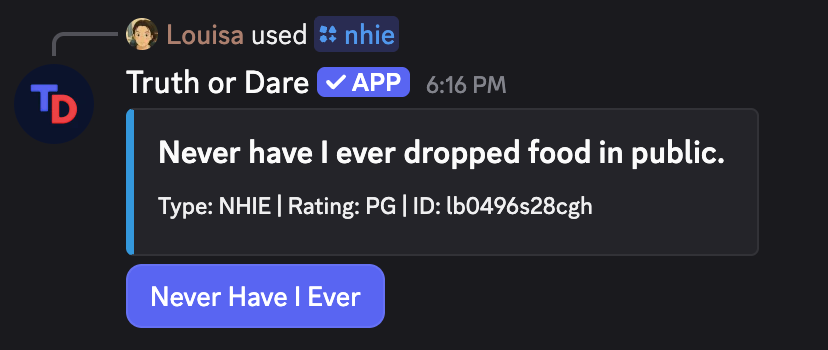 /nhie(Never Have I Ever) – Bot provides a “Never have I ever…” statement. In practice, participants would typically respond if they have or haven’t (often used as a drinking game or points game offline). In Discord, you might just discuss who has done it.