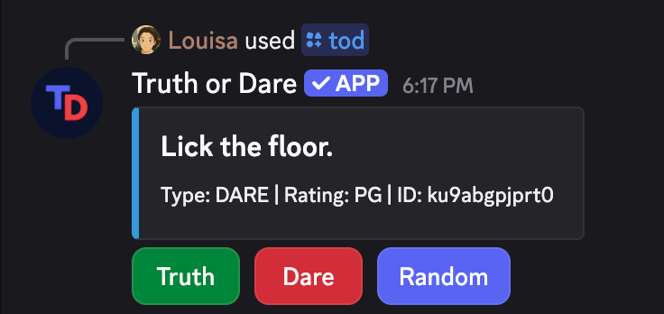/truthor/dareto get prompts. By default it’s PG-13; keep it family-friendly unless you’re in <#NSFWchannel> where adult mode is allowed. This is great for voice chats or just to spark fun conversations. Please respect each other’s comfort: you can always skip a question or dare if you’re not okay with it.” Setting these expectations helps everyone feel safe playing. - Run an Event (Optional): A good way to kickstart usage is hosting an official truth-or-dare session. Maybe on a weekend night in voice/video where people are a bit more relaxed. Use the bot to generate prompts, then have the group take turns choosing truth or dare. The bot’s random prompts add excitement and remove the pressure of coming up with things. You as host can moderate, maybe pre-select rating mode based on participants. This can demonstrate the bot’s fun and encourage later spontaneous use.