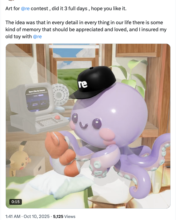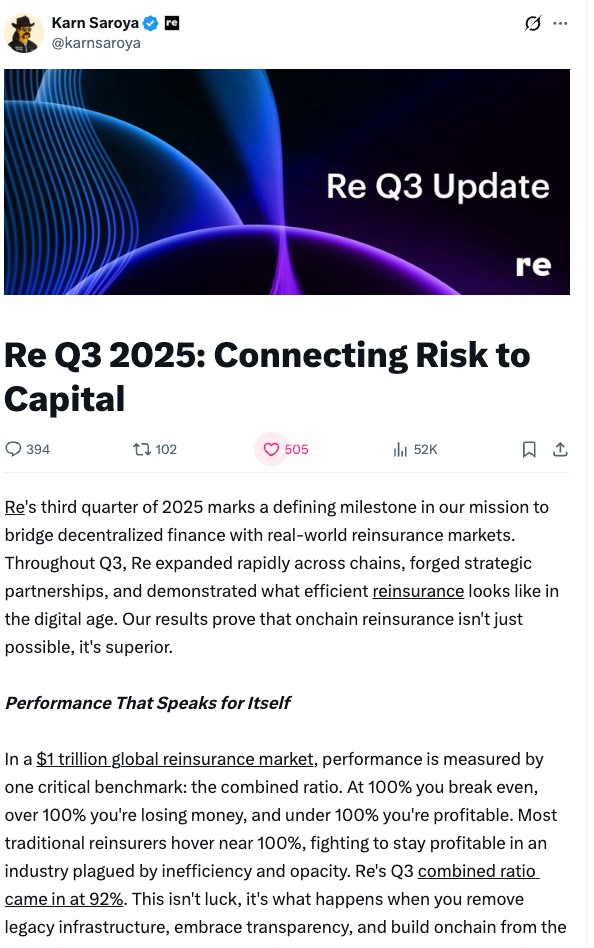 Another key point is to view your brand presence as a network of accounts, including both the official handles and those of core team members. Ultimately, people prefer interacting with other people rather than abstract concepts. Therefore, when there is important news or educational material to share, Re ensures that all core team members are discussing the same topic. Below is a screenshot of a core team member sharing Re’s Q3 progress.