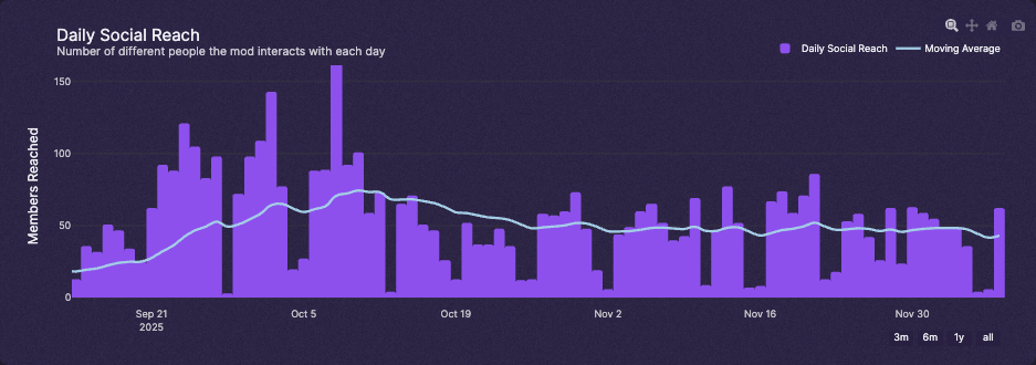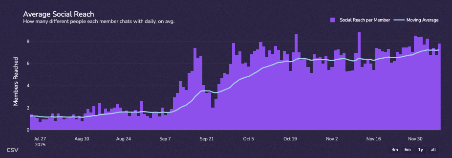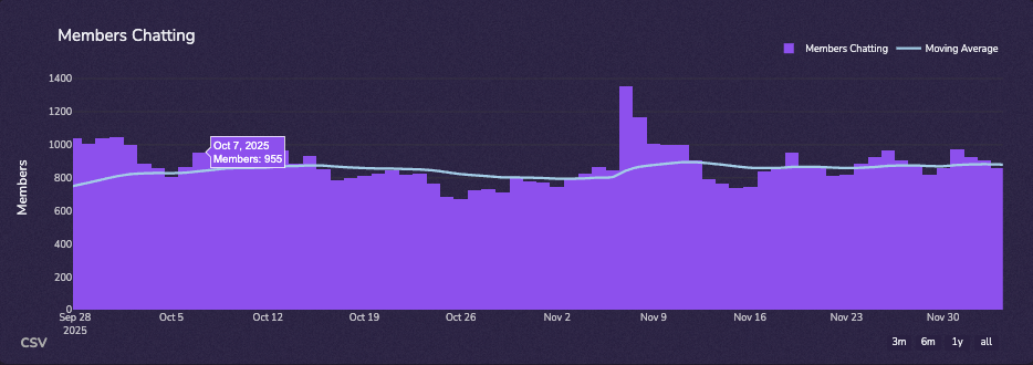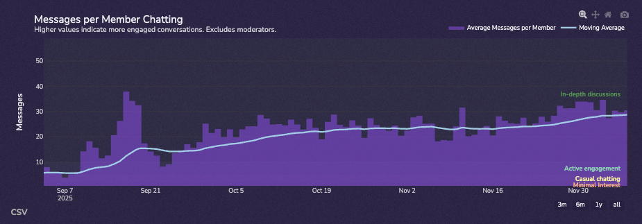 According to our analytics, over 900 people chat every day, collectively sending roughly 30+ messages per member. That's about half an hour a day, per person. Their social reach—basically how often members talk to other members—sits around 6. The average crypto discord? 2.5. And their 5-minute chat retention is above 50%, compared to the typical 40%.