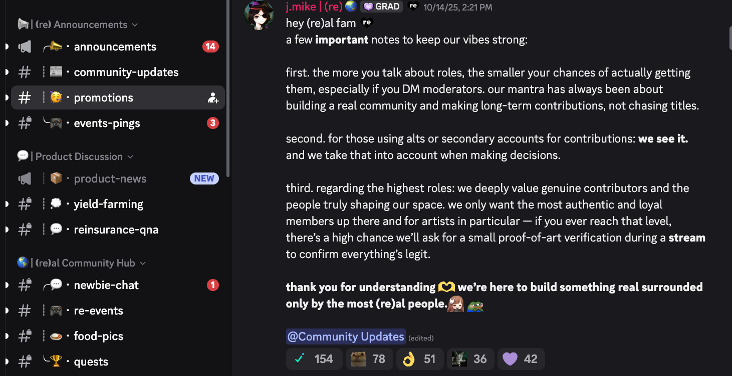 Most crypto Discord servers follow a predictable pattern: explosive growth, then a steady decline. Steph and Chaz break this mold entirely. Re's Discord community actually gets stronger as it grows. Engagement goes up instead of down—which is rare enough in the crypto space to be genuinely fascinating.