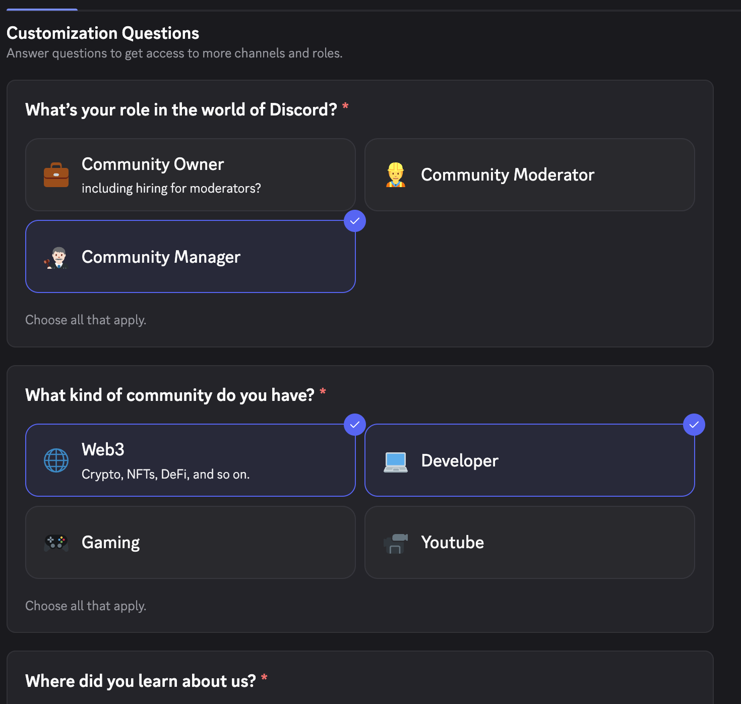 Discord's Community Onboarding feature (available since March 2023) flips the traditional verification process on its head. Instead of making new members jump through hoops to access your server, you let them choose their own adventure during signup.