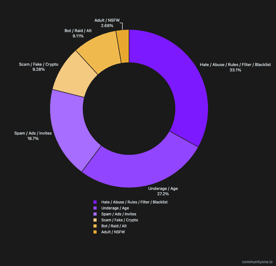 While often labeled as "Underage / Age," a massive portion of these bans are actually triggered by AutoMod rules targeting very young account ages, not necessarily the physical age of the human behind the keyboard. Interestingly, this exact same "Burner Account" strategy is the primary weapon in Web3 and giveaway attacks—making these two seemingly different worlds highly similar in proportion and intent.