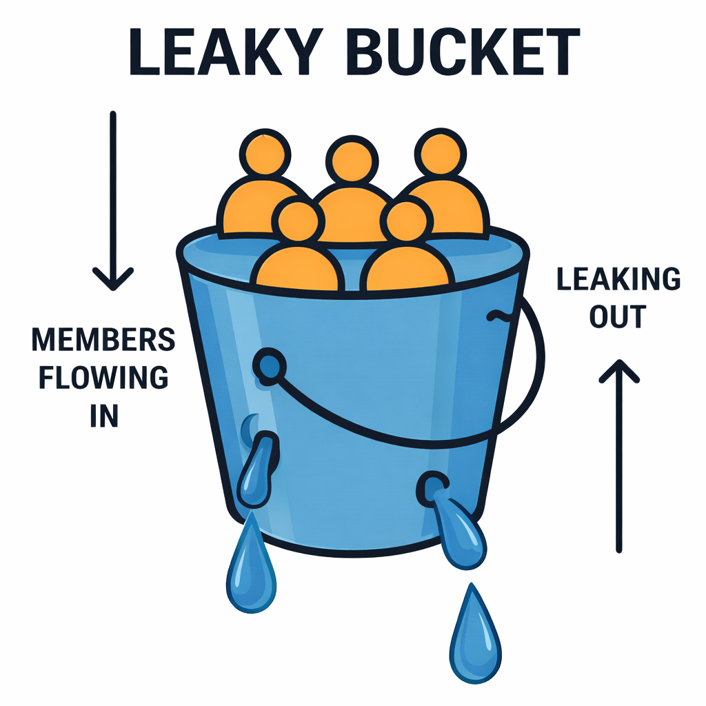 Pouring energy into blindly inviting hundreds of new people won't work if your foundational community experience is broken. Industry data reveals that user retention is far more critical than simple acquisition, a dynamic perfectly illustrated by the "Leaky Bucket" concept. There is no benefit to pouring fresh members into a bucket that has gaping holes in the bottom. Fixing the conversational flow, establishing clear roles, and creating an engaging vibe patches those holes so that the people you attract actually decide to stick around.