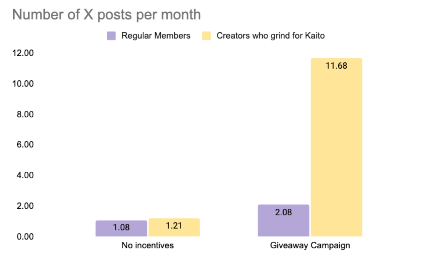 Here's our data to prove it. With a properly incentivized Kaito campaign (with tokens or USDC), mercenary creators make about 12 posts per month during the campaign. However, your regular members will make only 1 extra post per month on average because of your token or cash.