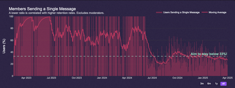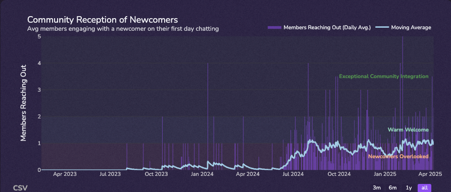 Specifically, look for signs of a healthy conversational flow within this window. An encouraging chat environment, filled with friendly exchanges and welcoming gestures, can significantly boost this vital statistic while paving the way for increased chat retention. Below, we track community reception of newcomers, ie how many people greet the new member when he/she first joins the server.