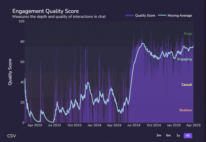 Creating valuable discussion topics is crucial in fostering a thriving community on your Discord server. By focusing on engaging topics, you can inspire members to actively participate. Below we show you our Engagement Quality Score KPI. It is a composite indicator including words per message, message per members, % of messages as replies, as GIFs and time spent.