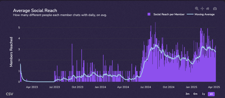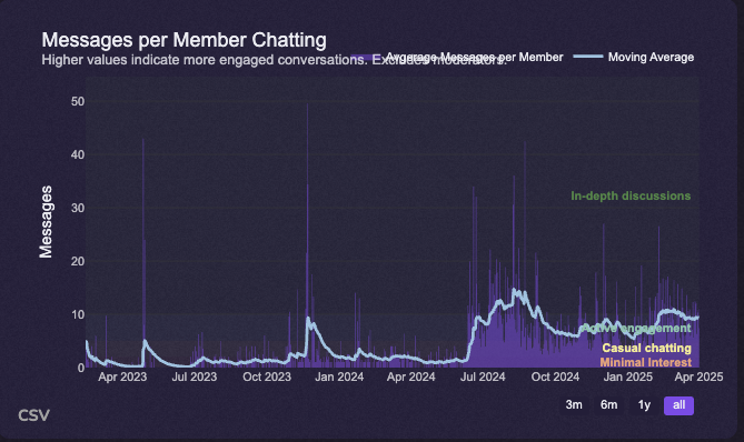 The messages per member metric is a vital benchmark for assessing expanding community involvement, offering a clear snapshot of how actively each participant communicates. By scrutinizing this indicator, you gain insight into the vibrancy of conversations. In general, you want message per member to be above 4. In regular web2 servers, we see message per member hovering around 20.