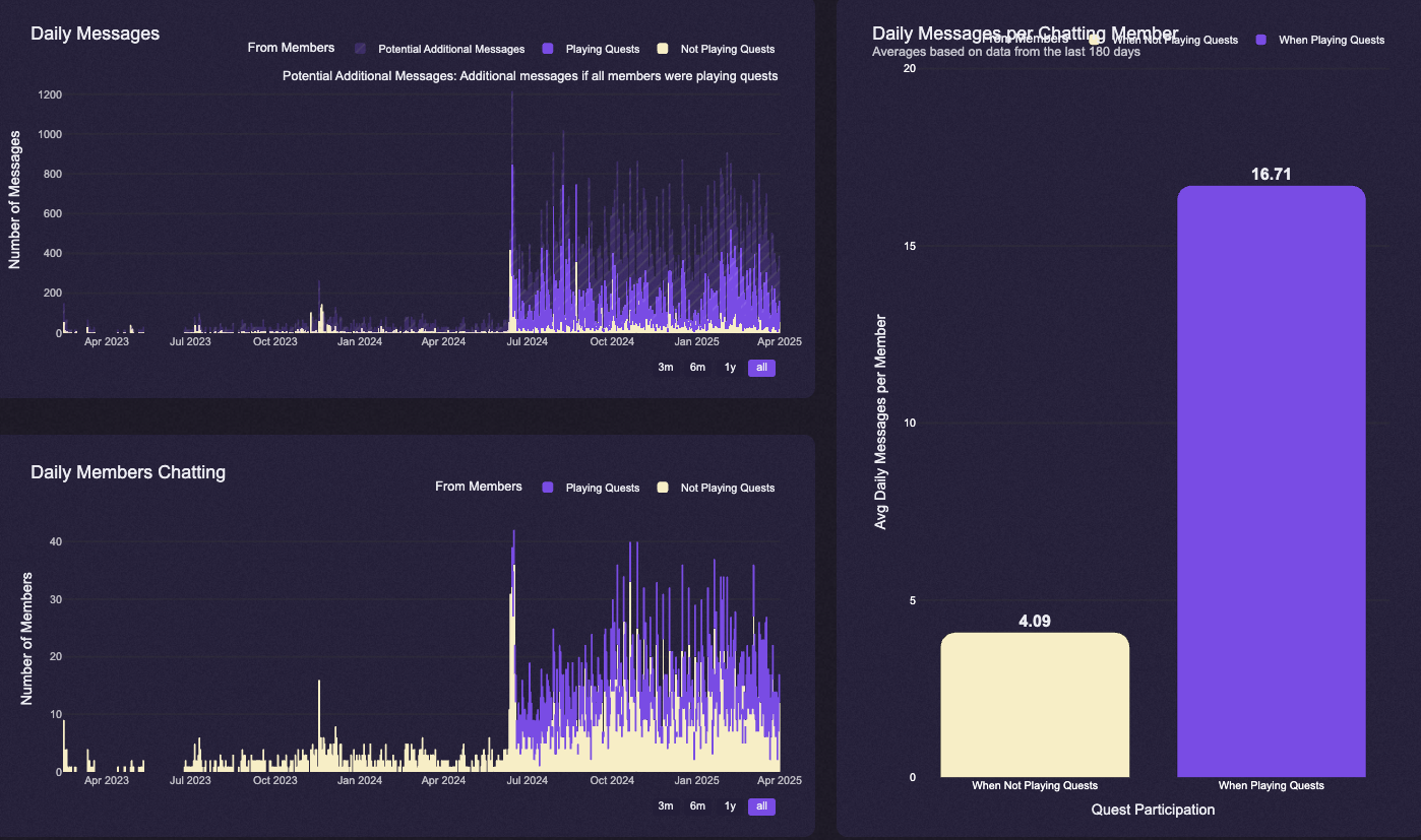 Hype Engine is a great automatic solution in improving messages per users. On average, members who pay quests do 4x more messages than regular members, or 20 messages per server. You can also find analytics of how hype engine performs in your own server.
