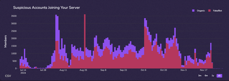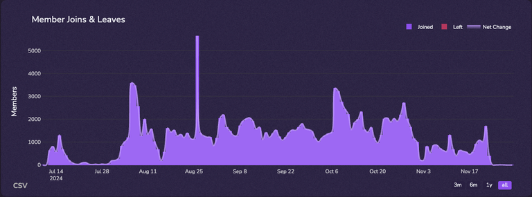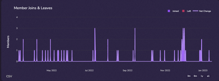 For Discord, member fluctuation data unveils the effectiveness of your outreach strategies, as well as the inherent appeal of your current products. For example, for relatively established products with a lot of members, it is natural to see a huge influx of members everyday. Most startups will see 10-50 people coming in organically.